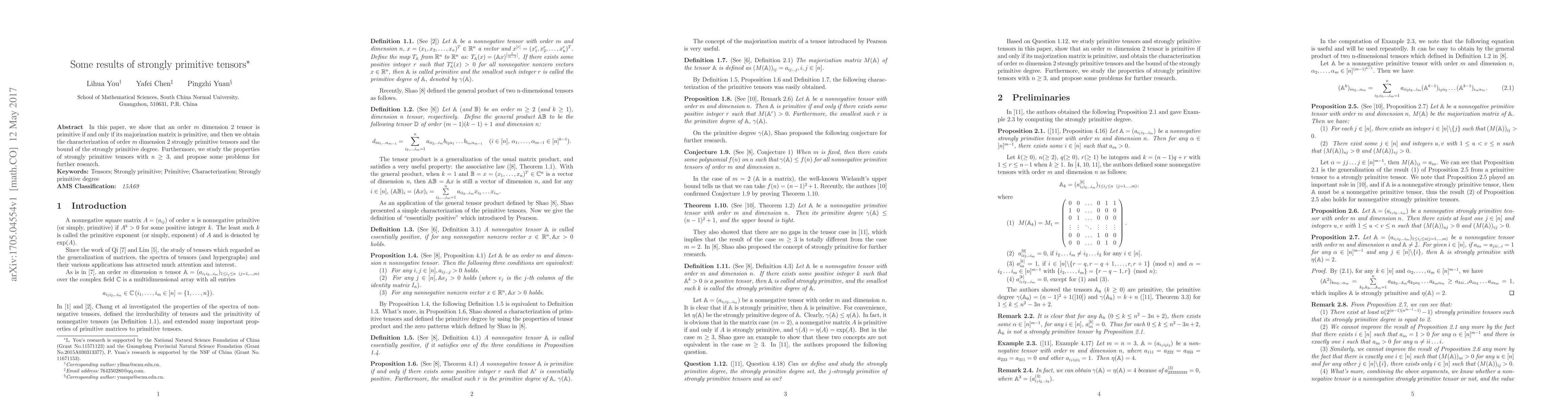 In this paper, we show that an order $m$ dimension 2 tensor is primitive if and only if its majorization matrix is primitive, and then we obtain the characterization of order $m$ dimension 2 strongly primitive tensors and the bound of the strongly primitive degree. Furthermore, we study the properties of strongly primitive tensors with $n\geq 3$, and propose some problems for further research.
