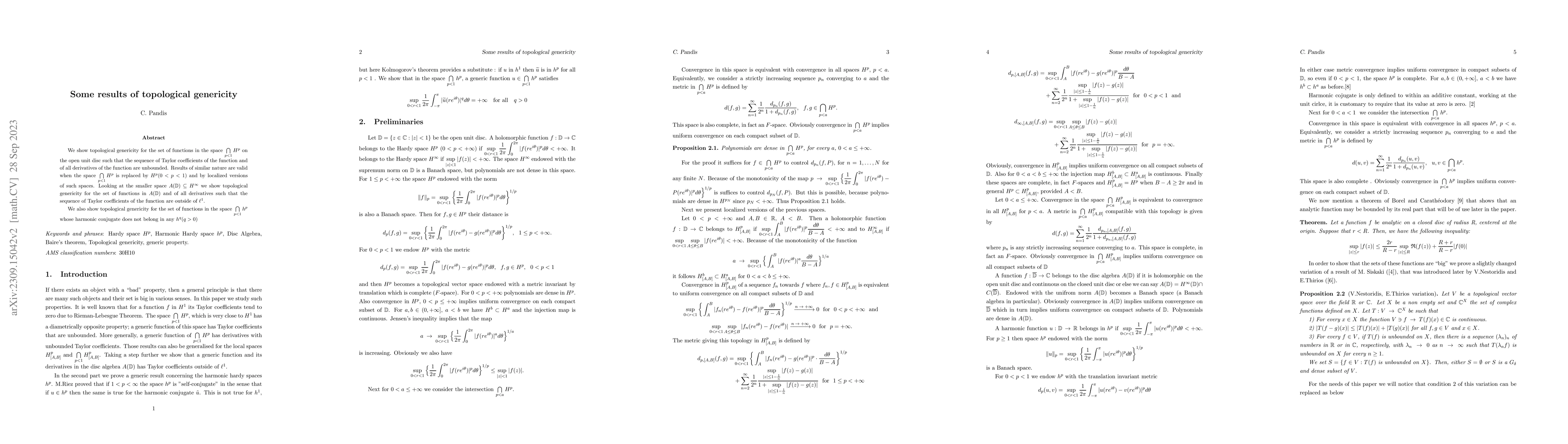 This paper demonstrates topological genericity for functions in specific Hardy and harmonic Hardy spaces on the open unit disc, where functions exhibit unbounded Taylor coefficients. It also extends these findings to localized versions of Hardy spaces and shows similar genericity for functions in the smaller space A(D) with Taylor coefficients outside (\el)^1.