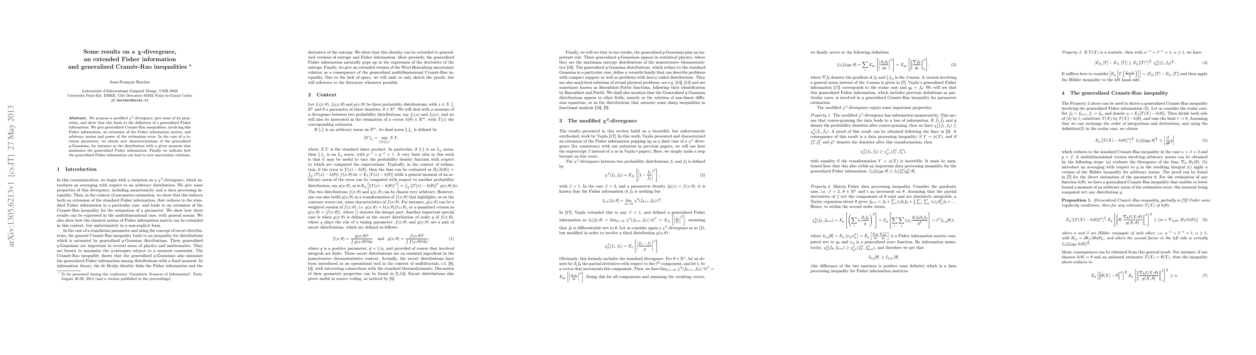 We propose a modified $\chi^{\beta}$-divergence, give some of its properties, and show that this leads to the definition of a generalized Fisher information. We give generalized Cram\'er-Rao inequalities, involving this Fisher information, an extension of the Fisher information matrix, and arbitrary norms and power of the estimation error. In the case of a location parameter, we obtain new characterizations of the generalized $q$-Gaussians, for instance as the distribution with a given moment that minimizes the generalized Fisher information. Finally we indicate how the generalized Fisher information can lead to new uncertainty relations.