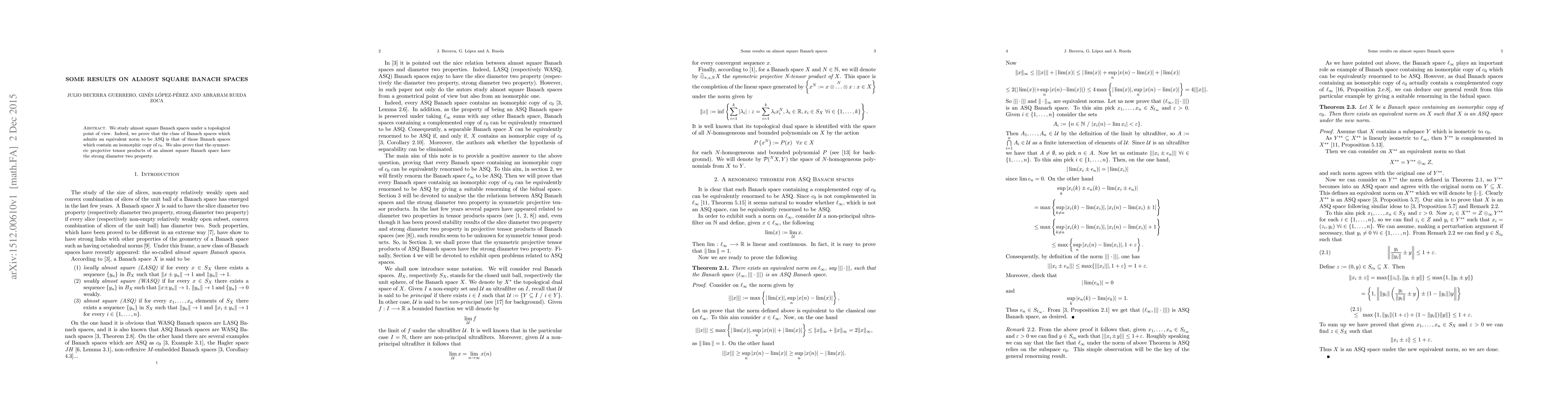 Summary: This paper investigates the topological properties of almost square Banach spaces (ASQ), proving that such spaces are equivalent to those containing an isomorphic copy of $c_0$. Additionally, it demonstrates that the symmetric projective tensor products of ASQ spaces possess the strong diameter two property.