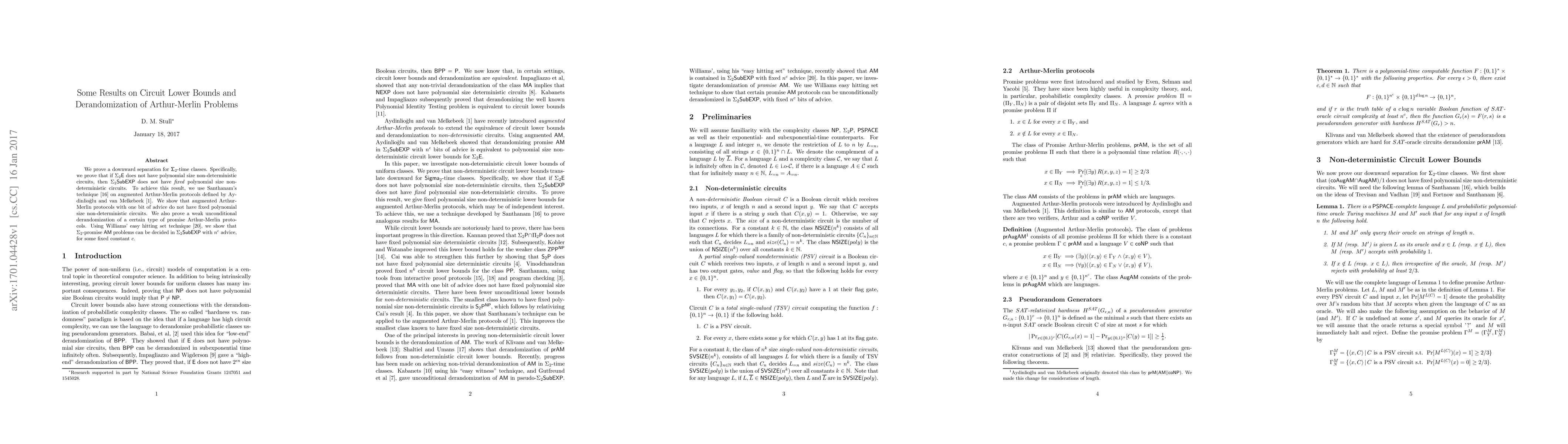 This paper establishes a circuit lower bound showing that if $\Sigma_2$E lacks polynomial size non-deterministic circuits, then $\Sigma_2$SubEXP also cannot have such circuits. It also demonstrates a weak derandomization for $\Sigma_2$-promise Arthur-Merlin problems using Williams' hitting set technique.
