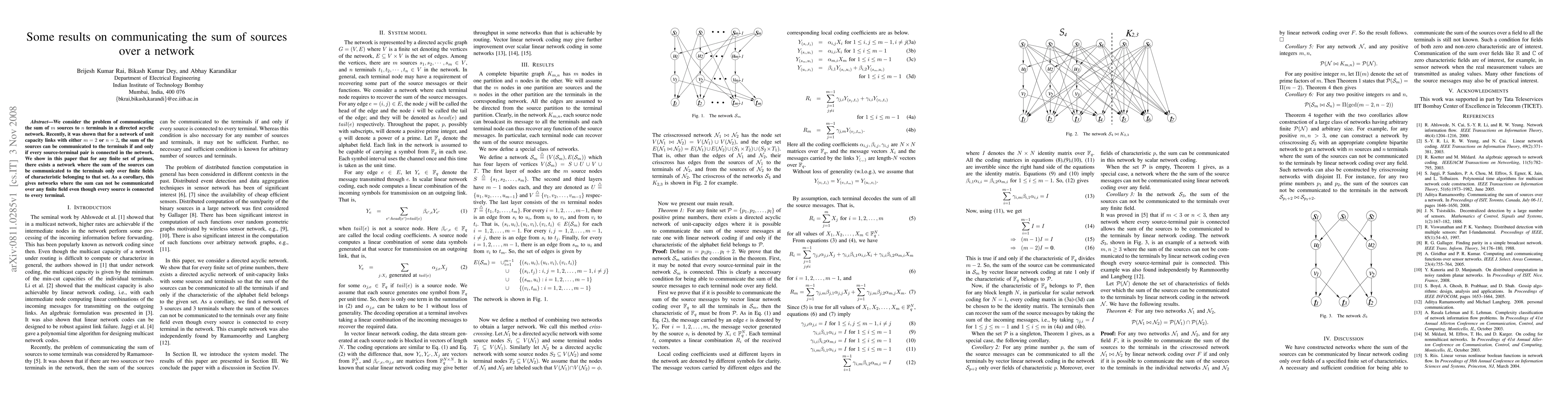 We consider the problem of communicating the sum of $m$ sources to $n$ terminals in a directed acyclic network. Recently, it was shown that for a network of unit capacity links with either $m=2$ or $n=2$, the sum of the sources can be communicated to the terminals if and only if every source-terminal pair is connected in the network. We show in this paper that for any finite set of primes, there exists a network where the sum of the sources can be communicated to the terminals only over finite fields of characteristic belonging to that set. As a corollary, this gives networks where the sum can not be communicated over any finite field even though every source is connected to every terminal.