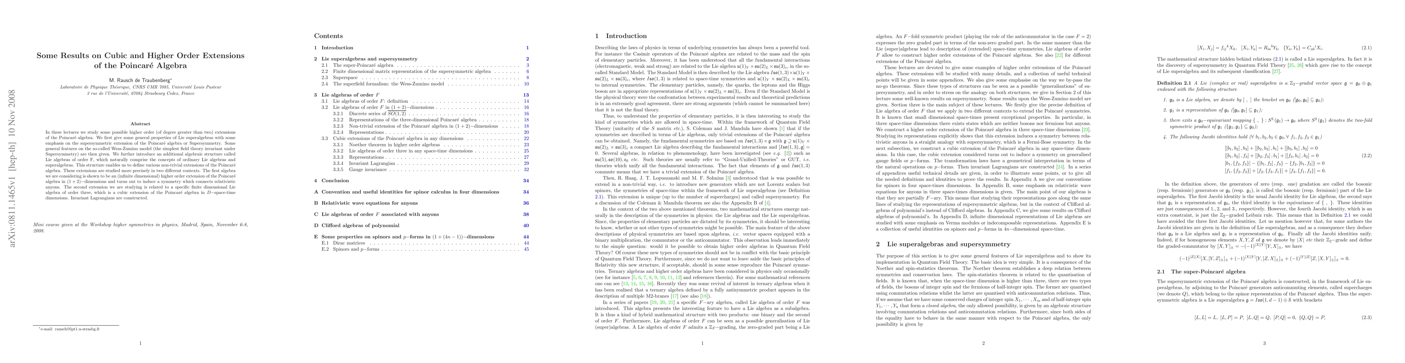 In these lectures we study some possible higher order (of degree greater than two) extensions of the Poincar\'e algebra. We first give some general properties of Lie superalgebras with some emphasis on the supersymmetric extension of the Poincar\'e algebra or Supersymmetry. Some general features on the so-called Wess-Zumino model (the simplest field theory invariant under Supersymmetry) are then given. We further introduce an additional algebraic structure called Lie algebras of order F, which naturally comprise the concepts of ordinary Lie algebras and superalgebras. This structure enables us to define various non-trivial extensions of the Poincar\'e algebra. These extensions are studied more precisely in two different contexts. The first algebra we are considering is shown to be an (infinite dimensional) higher order extension of the Poincar\'e algebra in $(1+2)-$dimensions and turns out to induce a symmetry which connects relativistic anyons. The second extension we are studying is related to a specific finite dimensional Lie algebra of order three, which is a cubic extension of the Poincar\'e algebra in $D-$space-time dimensions. Invariant Lagrangians are constructed.
