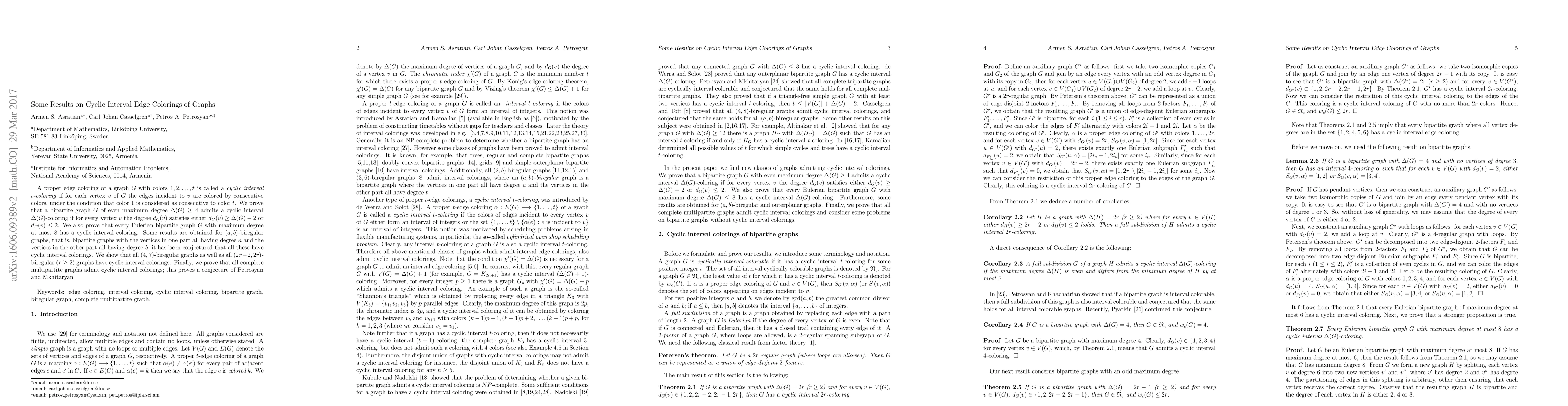 This paper investigates cyclic interval edge colorings of graphs, proving that bipartite graphs with specific degree conditions admit such colorings. It confirms that Eulerian bipartite graphs with maximum degree at most 8 and certain $(a,b)$-biregular graphs, including $(4,7)$-biregular and $(2r-2,2r)$-biregular ($r\geq 2$) graphs, possess cyclic interval colorings. Additionally, it settles a conjecture for complete multipartite graphs by showing they all admit cyclic interval colorings.
