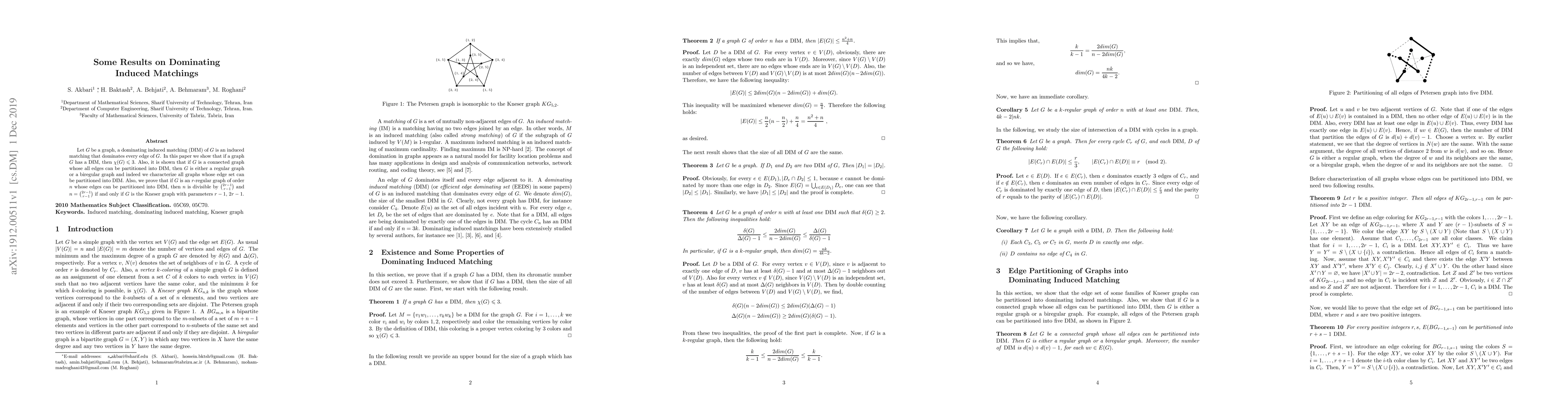 Let $G$ be a graph, a dominating induced matching (DIM) of $G$ is an induced matching that dominates every edge of $G$. In this paper we show that if a graph $G$ has a DIM, then $\chi(G) \leqslant 3$. Also, it is shown that if $G$ is a connected graph whose all edges can be partitioned into DIM, then $G$ is either a regular graph or a biregular graph and indeed we characterize all graphs whose edge set can be partitioned into DIM. Also, we prove that if $G$ is an $r$-regular graph of order $n$ whose edges can be partitioned into DIM, then $n$ is divisible by $\binom{2r - 1}{r - 1}$ and $n = \binom{2r - 1}{r - 1}$ if and only if $G$ is the Kneser graph with parameters $r-1$, $2r-1$.