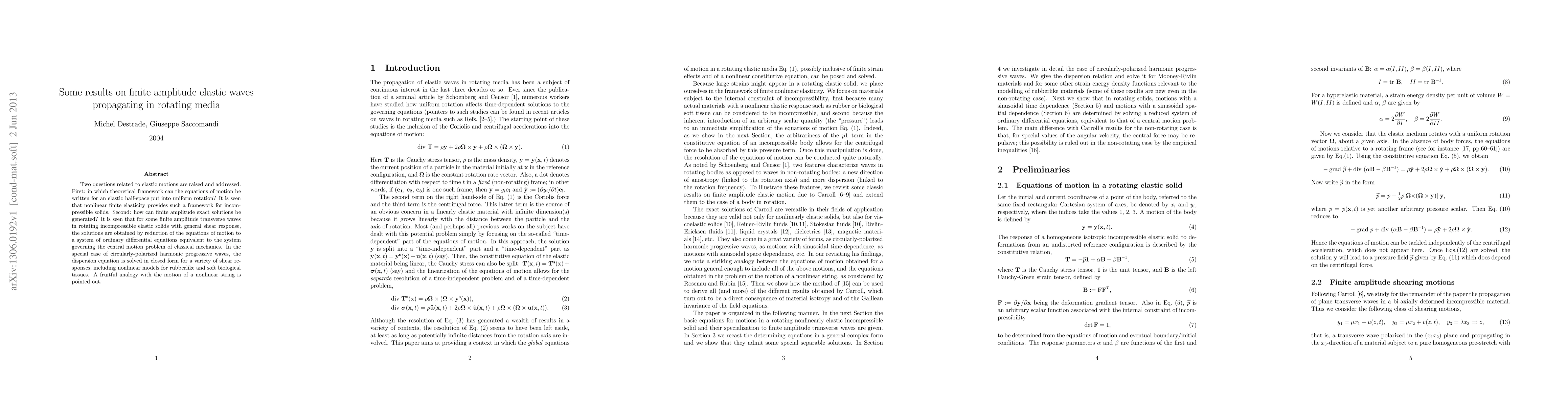 This paper explores the theoretical framework for elastic waves in rotating media, demonstrating that nonlinear finite elasticity suits incompressible solids. It also generates finite amplitude exact solutions by reducing the equations of motion to ordinary differential equations, analogous to classical mechanics, and solves the dispersion equation for circularly-polarized waves in various shear responses.