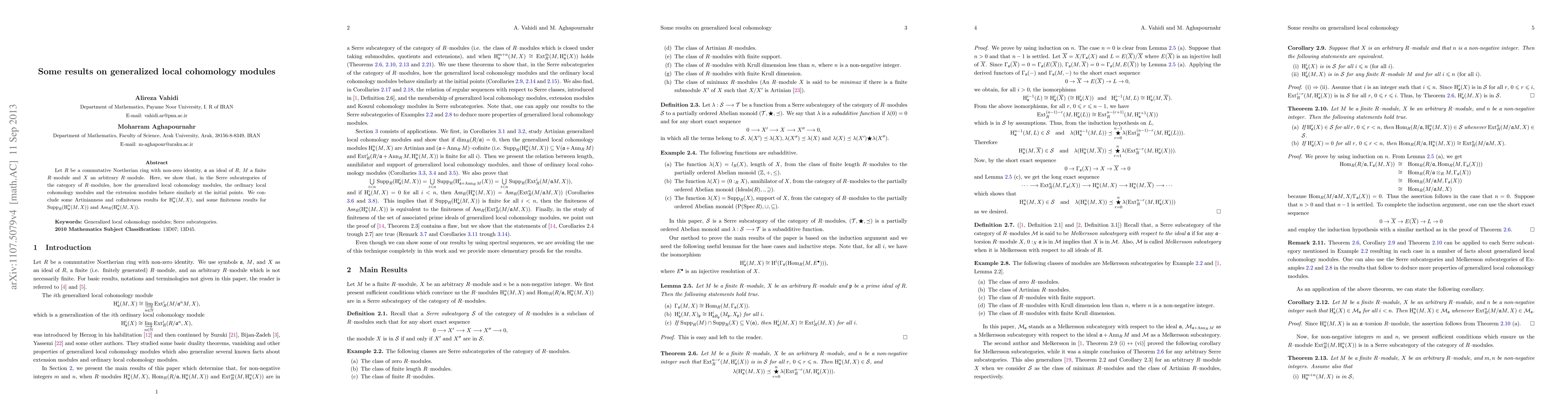 This paper investigates the behavior of generalized local cohomology modules in the context of commutative Noetherian rings, showing their similarity to ordinary local cohomology modules within Serre subcategories. The study concludes with Artinianness, cofiniteness, and finiteness results for these modules.