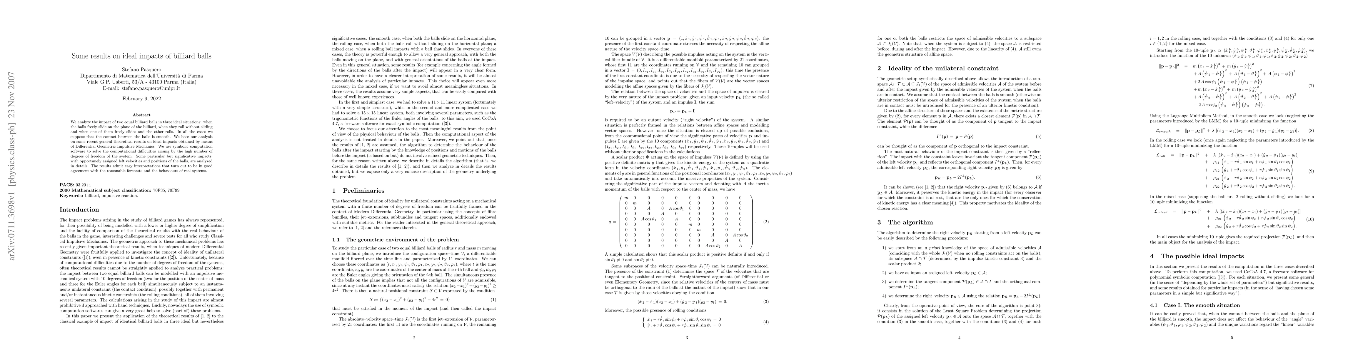Researchers analyzed ideal impacts of two billiard balls in various scenarios using differential geometric impulsive mechanics, revealing results that align with reasonable forecasts and real-world behaviors.