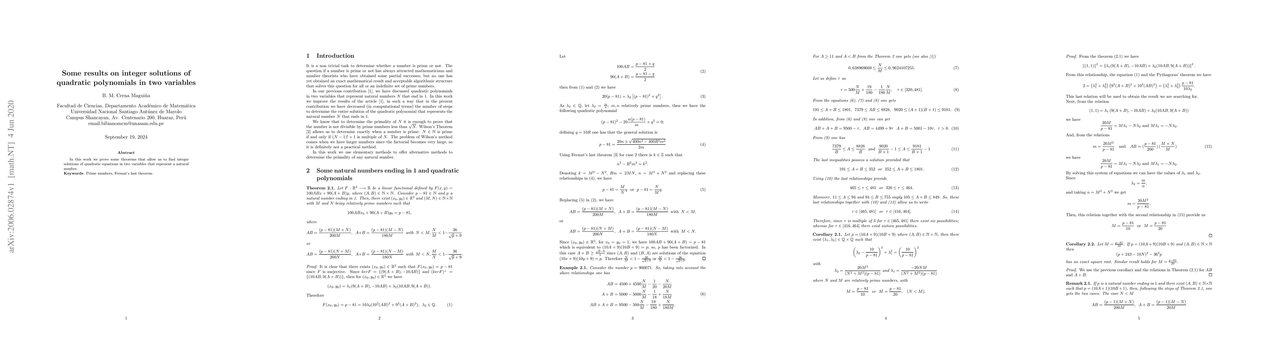 We use ideas from our previous work to obtain some theorems that will allow us to obtain the integer solution of a quadratic polynomial in two variables that represents a natural number