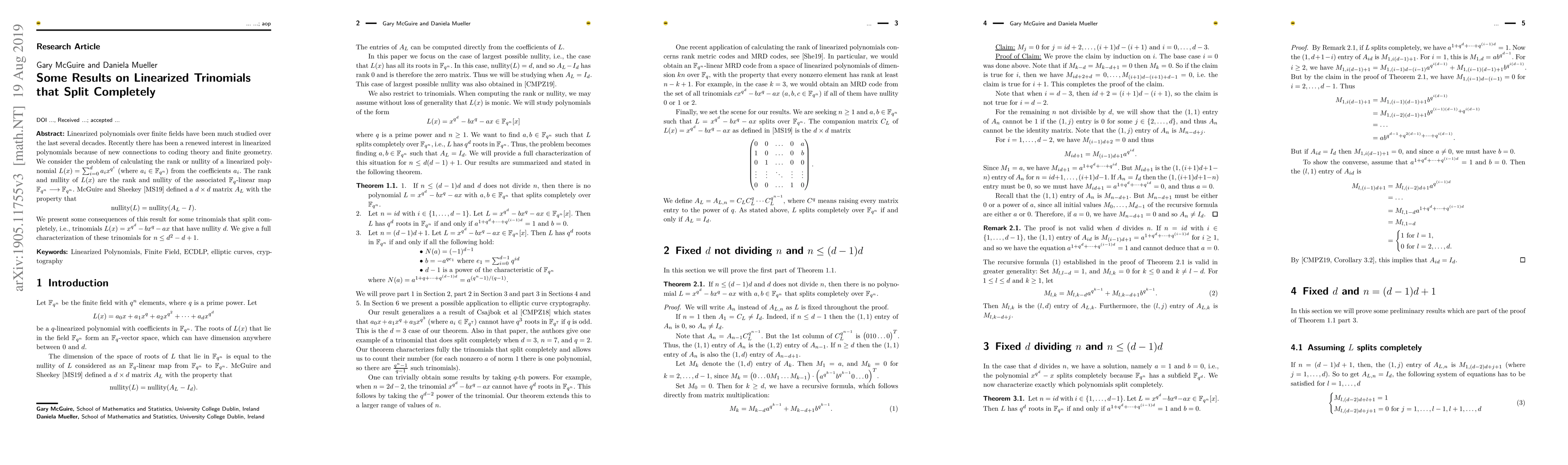 This paper investigates linearized polynomials over finite fields, focusing on the rank and nullity of such polynomials. It presents a matrix $A_L$ that helps determine the nullity of trinomials that split completely, providing a full characterization for trinomials under certain conditions.