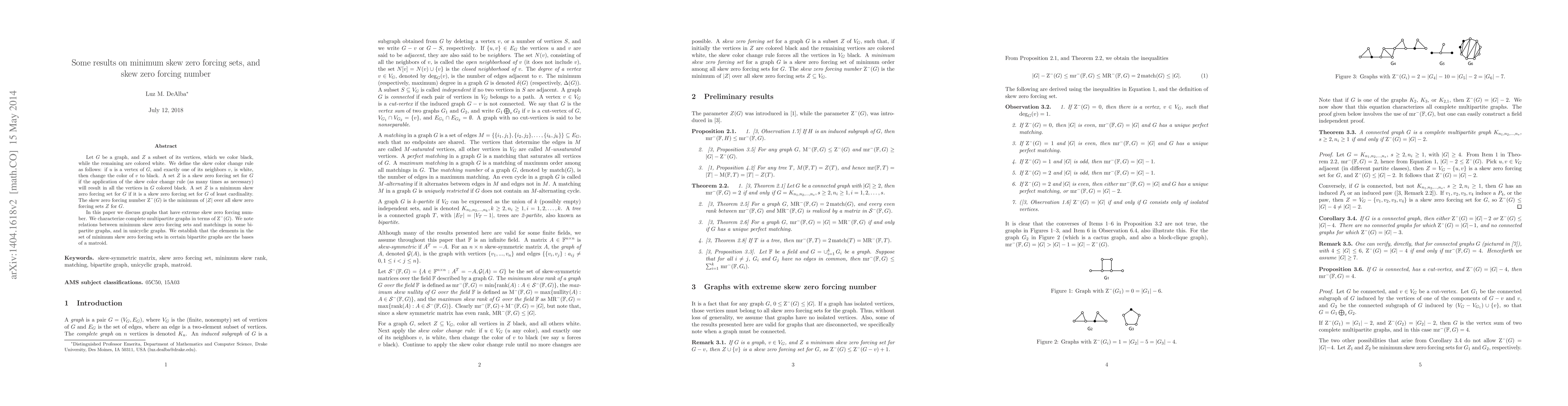 Let $G$ be a graph, and $Z$ a subset of its vertices, which we color black, while the remaining are colored white. We define the skew color change rule as follows: if $u$ is a vertex of $G$, and exactly one of its neighbors $v$, is white, then change the color of $v$ to black. A set $Z$ is a skew zero forcing set for $G$ if the application of the skew color change rule (as many times as necessary) will result in all the vertices in $G$ colored black. A set $Z$ is a minimum skew zero forcing set for $G$ if it is a skew zero forcing set for $G$ of least cardinality. The skew zero forcing number $\sZ (G)$ is the minimum of $|Z|$ over all skew zero forcing sets $Z$ for $G$. In this paper we discuss graphs that have extreme skew zero forcing number. We characterize complete multipartite graphs in terms of $\sZ (G)$. We note relations between minimum skew zero forcing sets and matchings in some bipartite graphs, and in unicyclic graphs. We establish that the elements in the set of minimum skew zero forcing sets in certain bipartite graphs are the bases of a matroid.