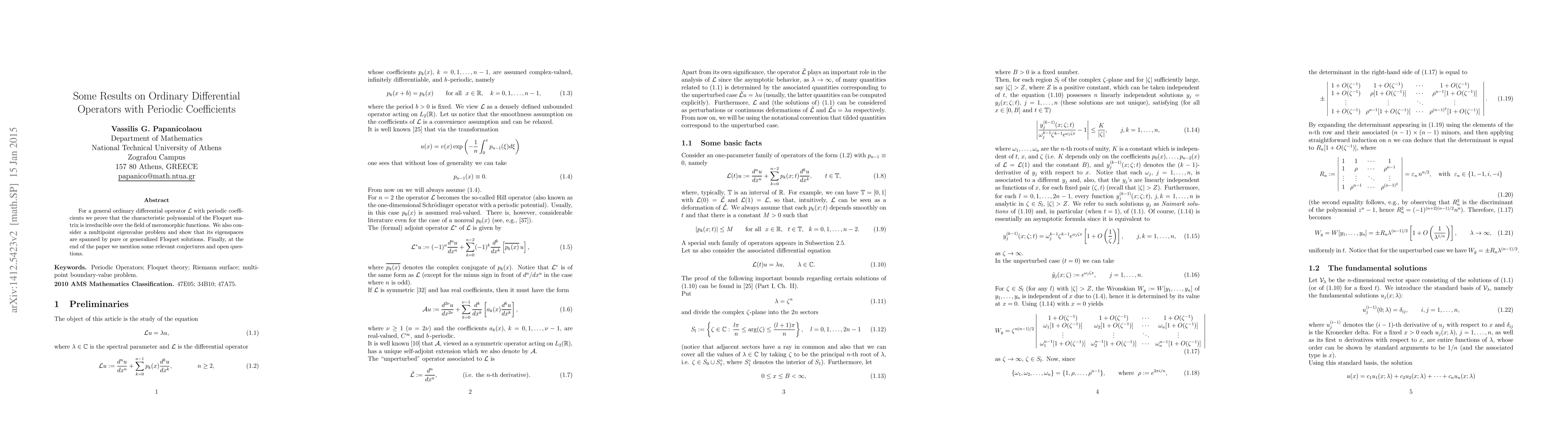 For a general ordinary differential operator $\mathcal{L}$ with periodic coefficients we prove that the characteristic polynomial of the Floquet matrix is irreducible over the field of meromorphic functions. We also consider a multipoint eigenvalue problem and show that its eigenspaces are spanned by pure or generalized Floquet solutions. Finally, at the end of the paper we mention some relevant conjectures and open questions.