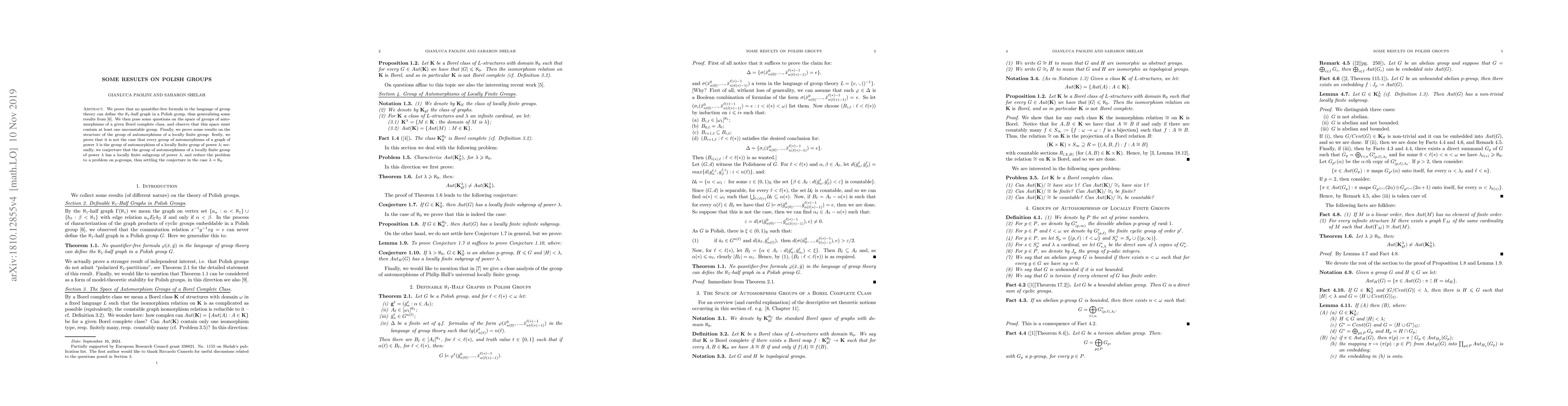 We prove that no quantifier-free formula in the language of group theory can define the $\aleph_1$-half graph in a Polish group, thus generalising some results from [6]. We then pose some questions on the space of groups of automorphisms of a given Borel complete class, and observe that this space must contain at least one uncountable group. Finally, we prove some results on the structure of the group of automorphisms of a locally finite group: firstly, we prove that it is not the case that every group of automorphisms of a graph of power $\lambda$ is the group of automorphism of a locally finite group of power $\lambda$; secondly, we conjecture that the group of automorphisms of a locally finite group of power $\lambda$ has a locally finite subgroup of power $\lambda$, and reduce the problem to a problem on $p$-groups, thus settling the conjecture in the case $\lambda = \aleph_0$.