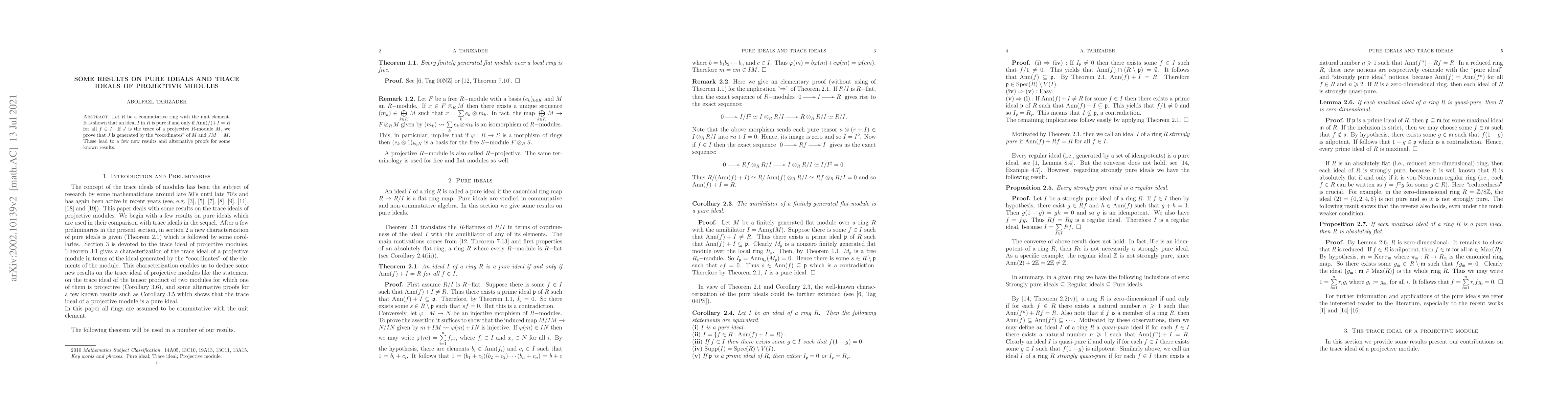 Let $R$ be a commutative ring with the unit element. It is shown that an ideal $I$ in $R$ is pure if and only if Ann$(f)+I=R$ for all $f\in I$. If $J$ is the trace of a projective $R$-module $M$, we prove that $J$ is generated by the ``coordinates" of $M$ and $JM = M$. These lead to a few new results and alternative proofs for some known results.