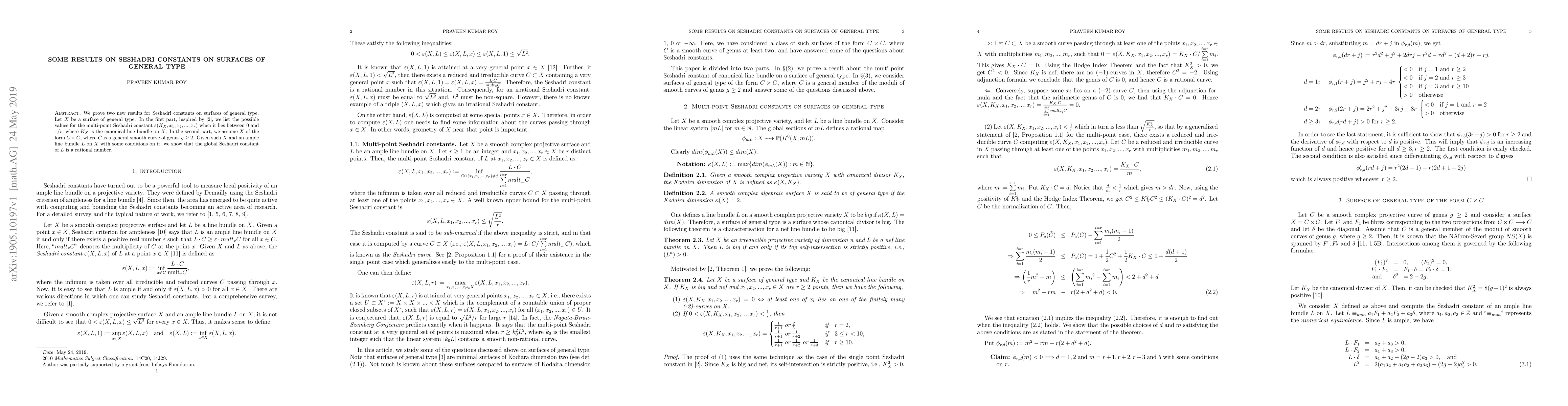 We prove two new results for Seshadri constants on surfaces of general type. Let $X$ be a surface of general type. In the first part, inspired by \cite{B-S}, we list the possible values for the multi-point Seshadri constant $\varepsilon(K_X,x_1,x_2,...,x_r)$ when it lies between $0$ and $1/r$, where $K_X$ is the canonical line bundle on $X$. In the second part, we assume $X$ of the form $C \times C$, where $C$ is a general smooth curve of genus $g \geq 2$. Given such $X$ and an ample line bundle $L$ on $X$ with some conditions on it, we show that the global Seshadri constant of $L$ is a rational number.