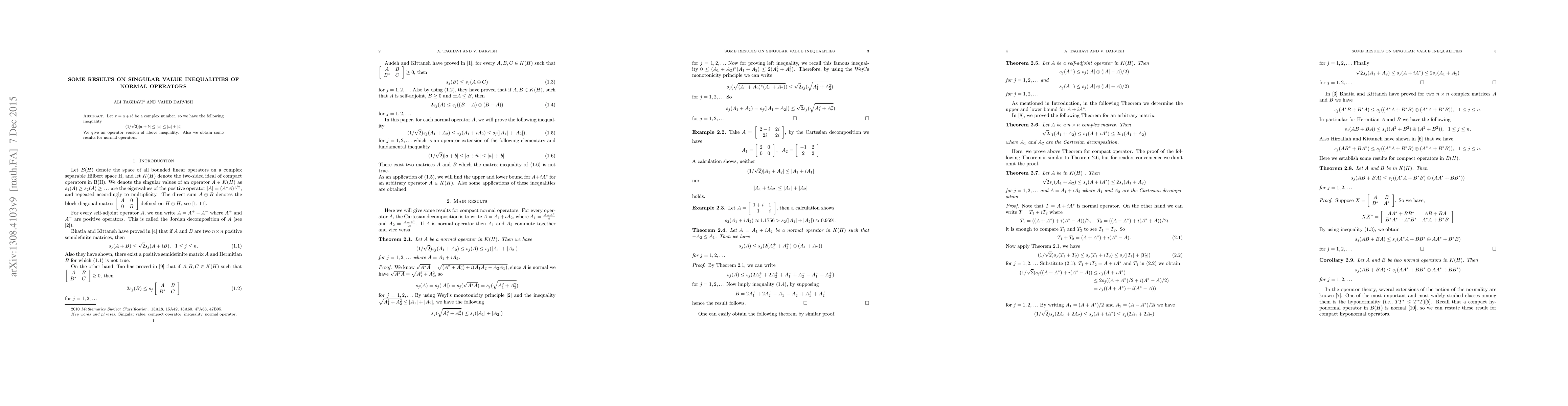 Let $x=a+ib$ be a complex number, so we have the following inequality $$(1/\sqrt{2})|a+b|\leq |x|\leq |a|+|b|$$ We give an operator version of above inequality. Also we obtain some results for normal operators.