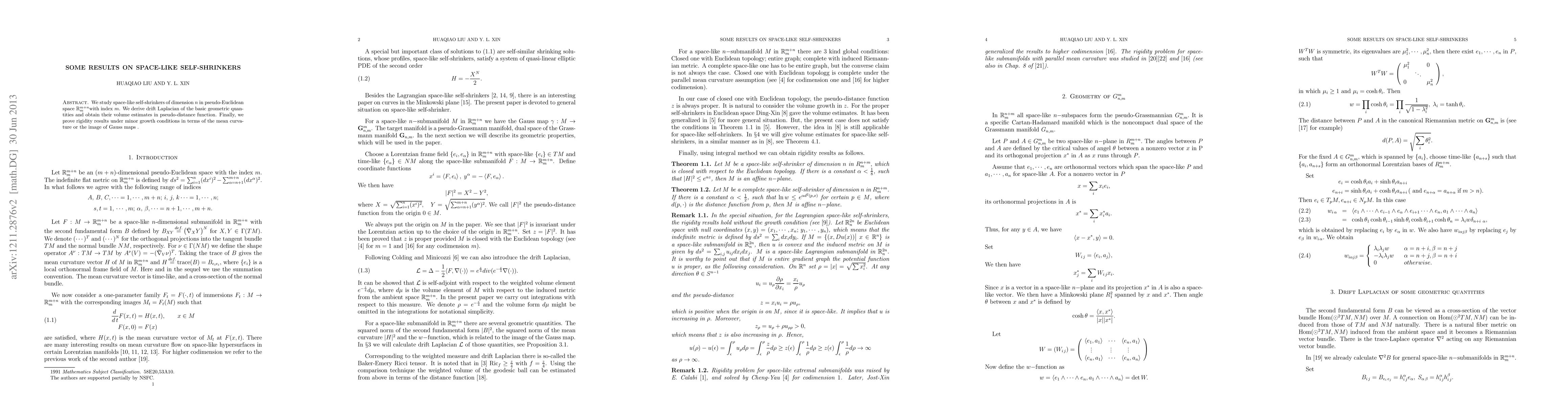 This paper investigates space-like self-shrinkers in pseudo-Euclidean space, deriving drift Laplacians for geometric quantities and obtaining volume estimates. It concludes with a rigidity result under minor growth conditions related to mean curvature or Gauss maps.