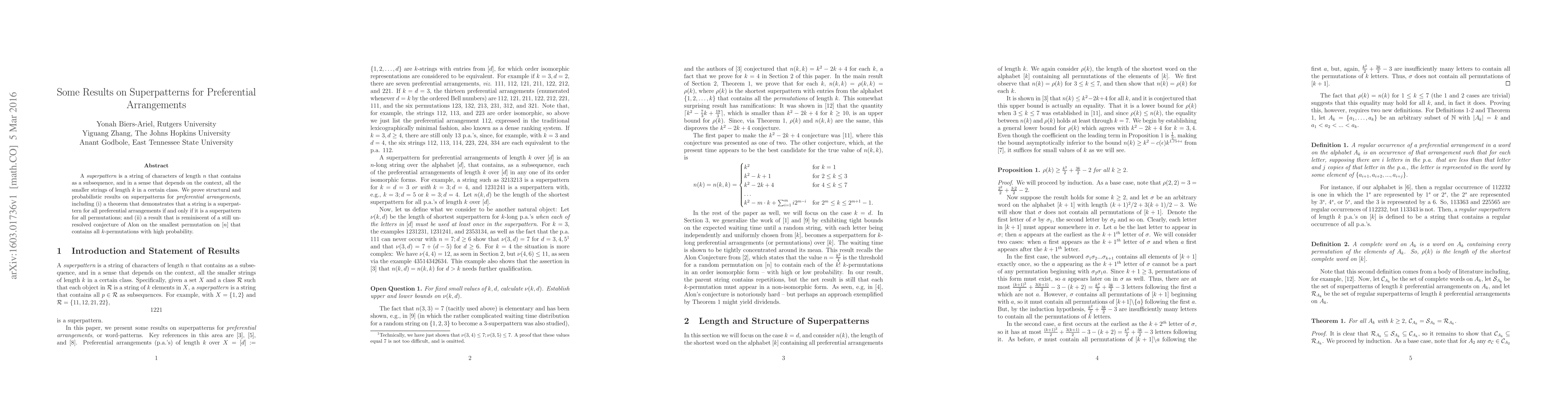 A {\it superpattern} is a string of characters of length $n$ that contains as a subsequence, and in a sense that depends on the context, all the smaller strings of length $k$ in a certain class. We prove structural and probabilistic results on superpatterns for {\em preferential arrangements}, including (i) a theorem that demonstrates that a string is a superpattern for all preferential arrangements if and only if it is a superpattern for all permutations; and (ii) a result that is reminiscent of a still unresolved conjecture of Alon on the smallest permutation on $[n]$ that contains all $k$-permutations with high probability.