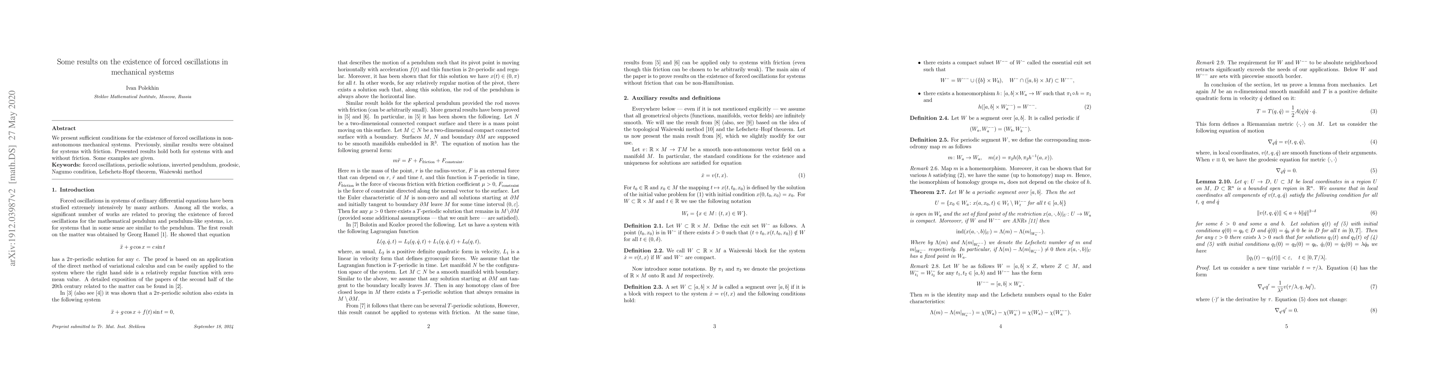 Summary: This research establishes sufficient conditions for forced oscillations in non-autonomous mechanical systems, extending previous results from friction-based systems to include both frictional and frictionless systems, with illustrative examples provided.