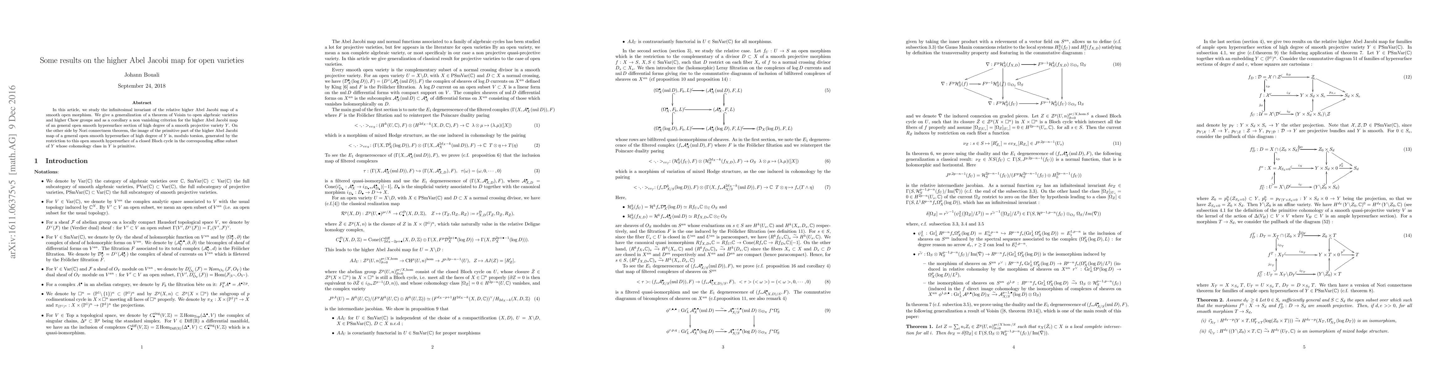 In this article, we study the infinitemisal invariant of the relative higher Abel Jacobi map of a smooth open morphism. We give a generalization of a theorem of Voisin to open varieties and higher Chow groups and as a corollary a non vanishing criterion for the higher Abel Jacobi map of a general open smooth hypersurface section of high degree of a smooth projective variety Y. On the other side, using Nori connectness theorem, the image of the primitive part of the higher Abel Jacobi map of a general open smooth hypersurface section of high degree of a smooth projective variety Y is generated by the image of the restriction of a primitive cycle on the corresponding affine subset of Y