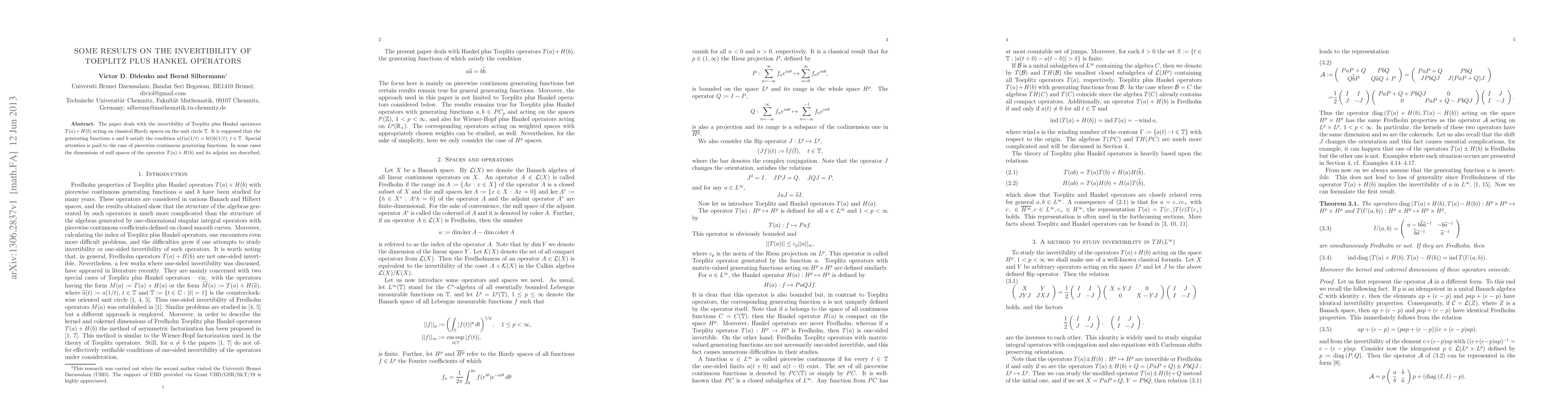 This paper investigates the invertibility of Toeplitz plus Hankel operators T(a)+H(b) on Hardy spaces, focusing on generating functions that satisfy a(t)a(1/t) = b(t)b(1/t). It particularly examines piecewise continuous functions and describes the dimensions of null spaces for these operators in certain scenarios.