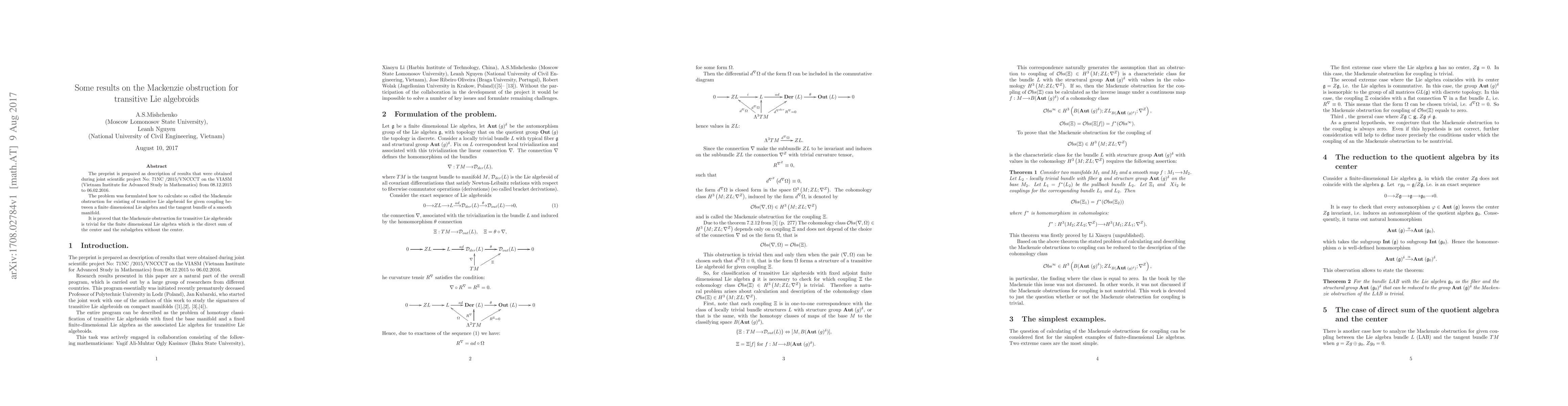 The preprint is prepared as description of results that were obtained during joint scientific project No: 71NC /2015/VNCCCT on the VIASM (Vietnam Institute for Advanced Study in Mathematics) from 08.12.2015 to 06.02.2016. The problem was formulated how to calculate so called the Mackenzie obstruction for existing of transitive Lie algebroid for given coupling between a finite dimensional Lie algebra and the tangent bundle of a smooth manifold. It is proved that the Mackenzie obstruction for transitive Lie algebroids is trivial for the finite dimensional Lie algebra which is the direct sum of the center and the subalgebra without the center.