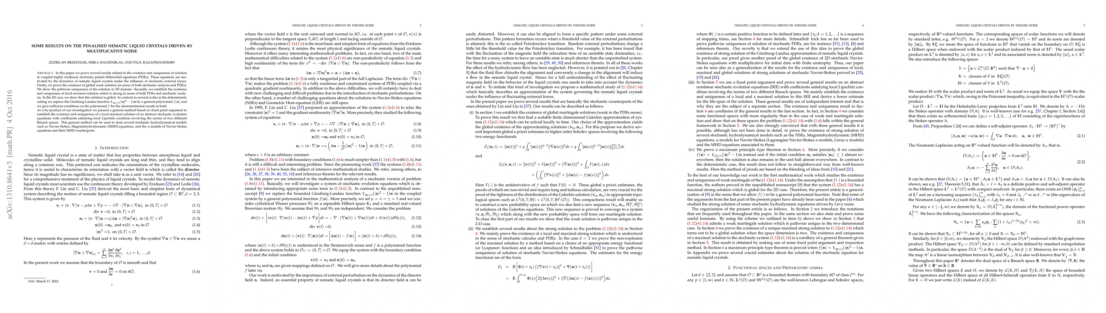 This paper proves existence and uniqueness of solutions to stochastic partial differential equations modeling nematic liquid crystals under multiplicative noise. It establishes global weak solutions and pathwise uniqueness in 2D, and a general method for abstract stochastic evolution equations applicable to various hydrodynamical models.