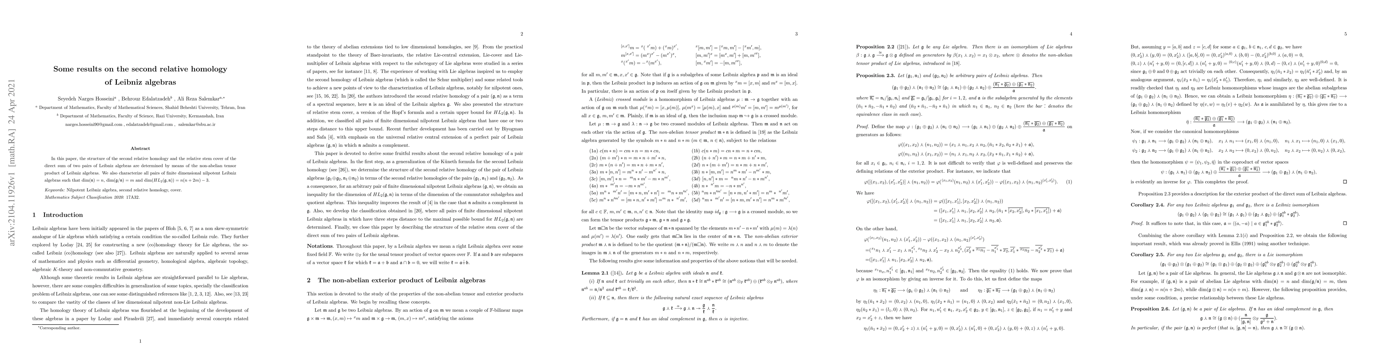 In this paper, the structure of the second relative homology and the relative stem cover of the direct sum of two pairs of Leibniz algebras are determined by means of the non-abelian tensor product of Leibniz algebras. We also characterize all pairs of finite dimensional nilpotent Leibniz algebras such that...