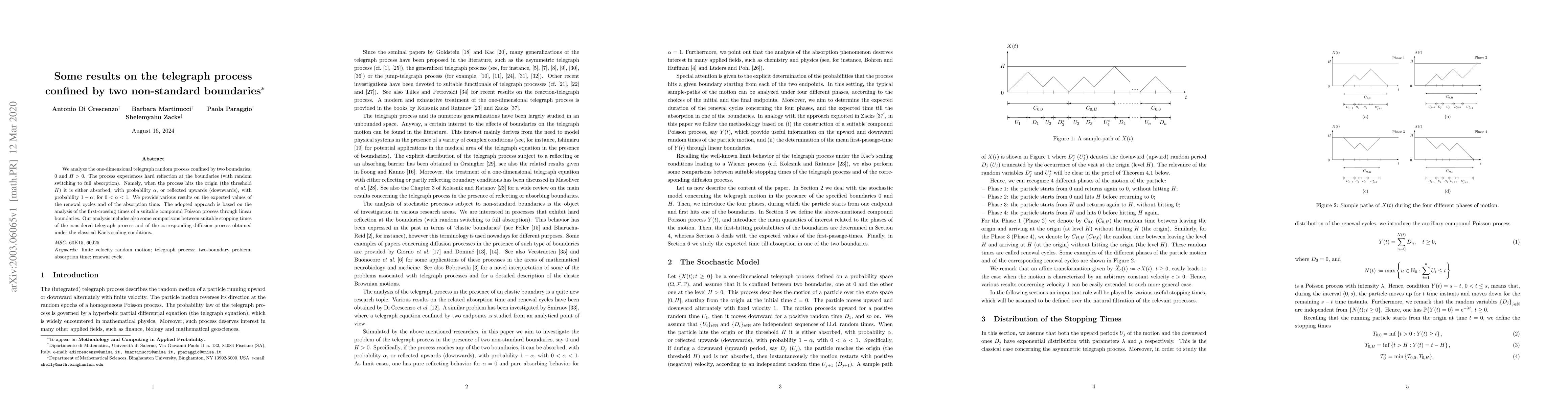 Researchers analyzed a one-dimensional telegraph random process confined by two boundaries with hard reflection at both ends, providing results on expected renewal cycles and absorption times.