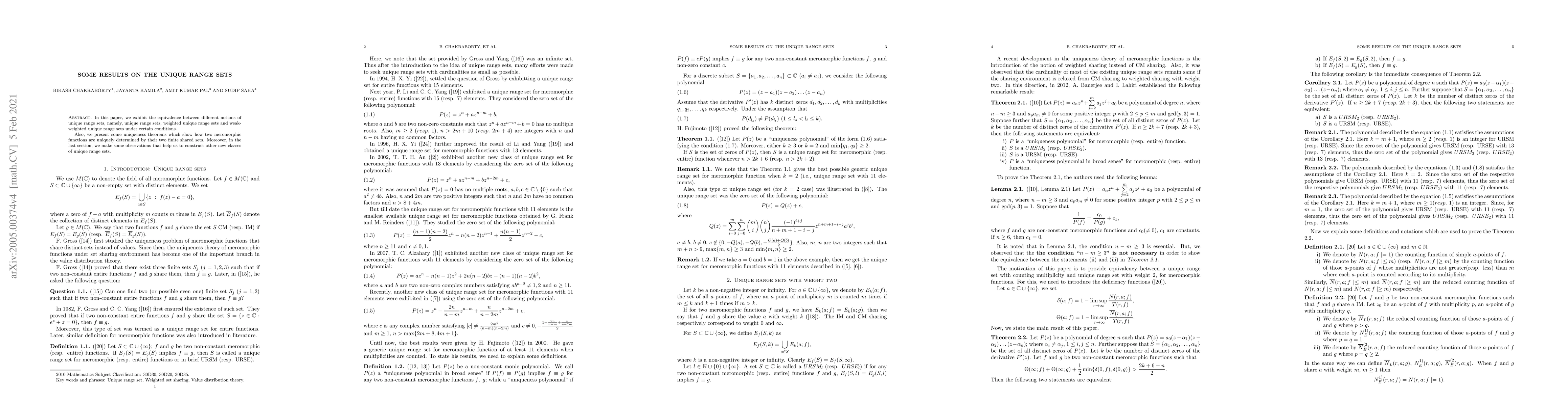 In this paper, we exhibit the equivalence between different notions of unique range sets, namely, unique range sets, weighted unique range sets and weak-weighted unique range sets under certain conditions.\par Also, we present some uniqueness theorems which show how two meromorphic functions are uniquely determined by their two finite shared sets. Moreover, in the last section, we make some observations that help us to construct other new classes of unique range sets.