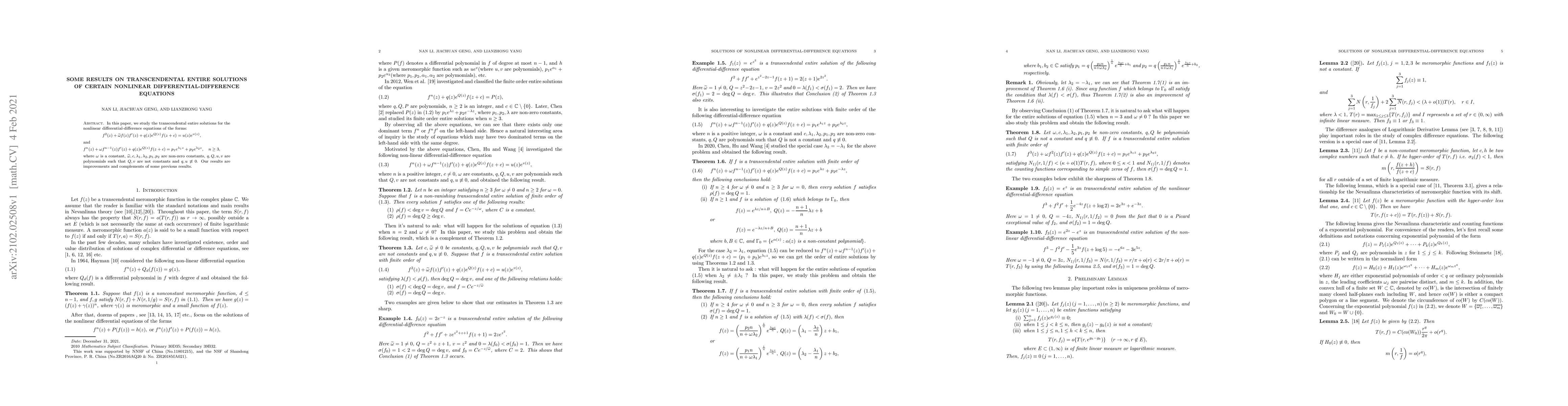 This paper investigates transcendental entire solutions for specific nonlinear differential-difference equations, providing improvements and complements to prior research. The focus is on equations involving polynomial terms and exponential functions.
