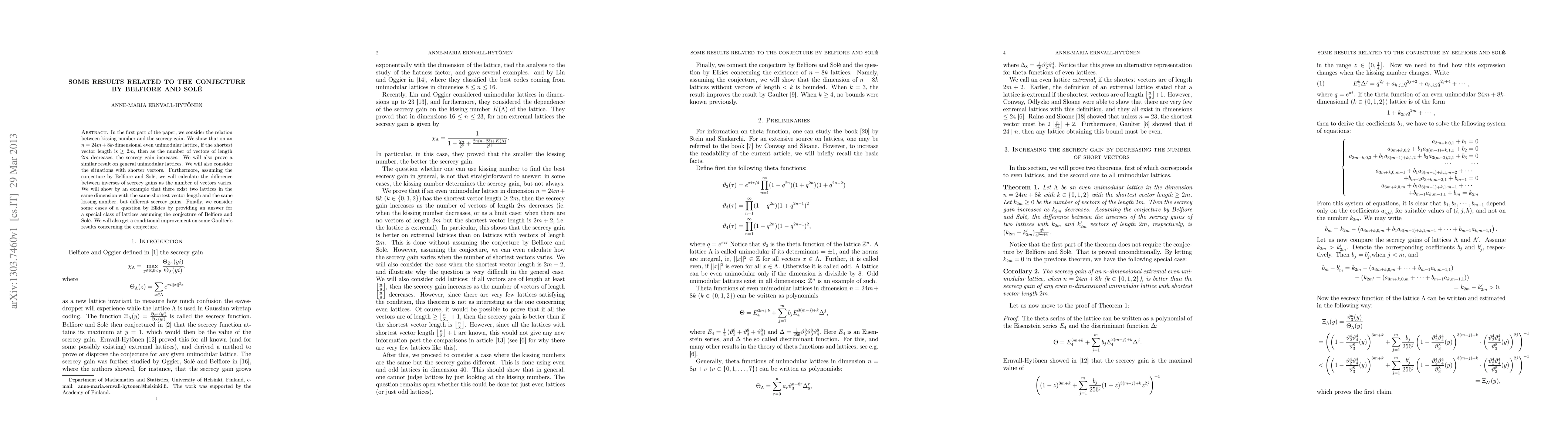 In the first part of the paper, we consider the relation between kissing number and the secrecy gain. We show that on an $n=24m+8k$-dimensional even unimodular lattice, if the shortest vector length is $\geq 2m$, then as the number of vectors of length $2m$ decreases, the secrecy gain increases. We will also prove a similar result on general unimodular lattices. We will also consider the situations with shorter vectors. Furthermore, assuming the conjecture by Belfiore and Sol\'e, we will calculate the difference between inverses of secrecy gains as the number of vectors varies. We will show by an example that there exist two lattices in the same dimension with the same shortest vector length and the same kissing number, but different secrecy gains. Finally, we consider some cases of a question by Elkies by providing an answer for a special class of lattices assuming the conjecture of Belfiore and Sol\'e. We will also get a conditional improvement on some Gaulter's results concerning the conjecture.