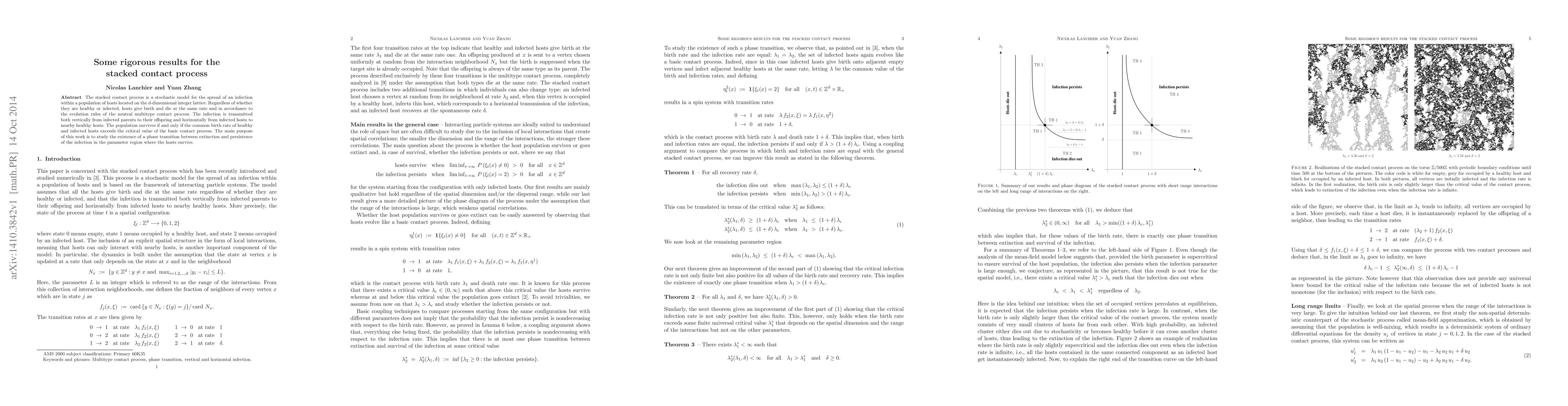 This paper explores the stacked contact process, a stochastic model for infection spread on a d-dimensional lattice. It establishes conditions for population survival and investigates a phase transition between infection extinction and persistence, finding that survival depends on the common birth rate exceeding a critical value.