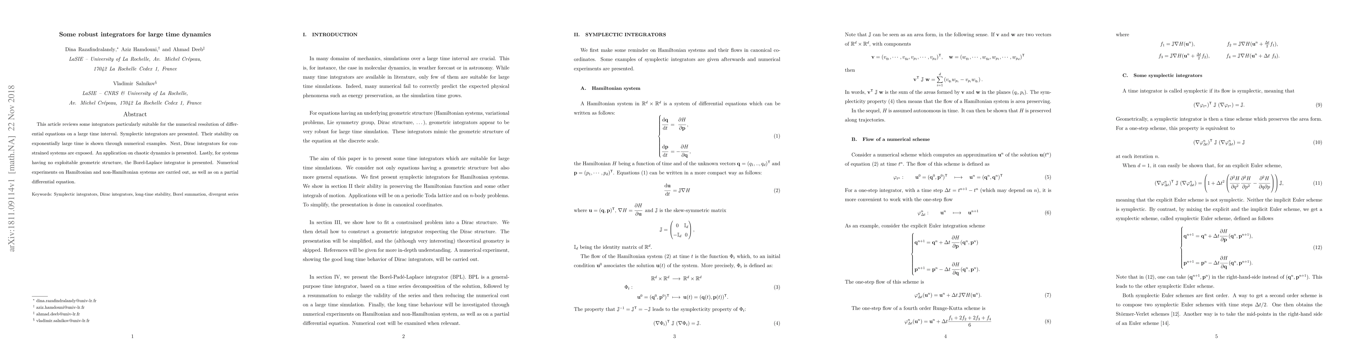 This article reviews some integrators particularly suitable for the numerical resolution of differential equations on a large time interval. Symplectic integrators are presented. Their stability on exponentially large time is shown through numerical examples. Next, Dirac integrators for constrained systems are exposed. An application on chaotic dynamics is presented. Lastly, for systems having no exploitable geometric structure, the Borel-Laplace integrator is presented. Numerical experiments on Hamiltonian and non-Hamiltonian systems are carried out, as well as on a partial differential equation. Keywords: Symplectic integrators, Dirac integrators, long-time stability, Borel summation, divergent series.