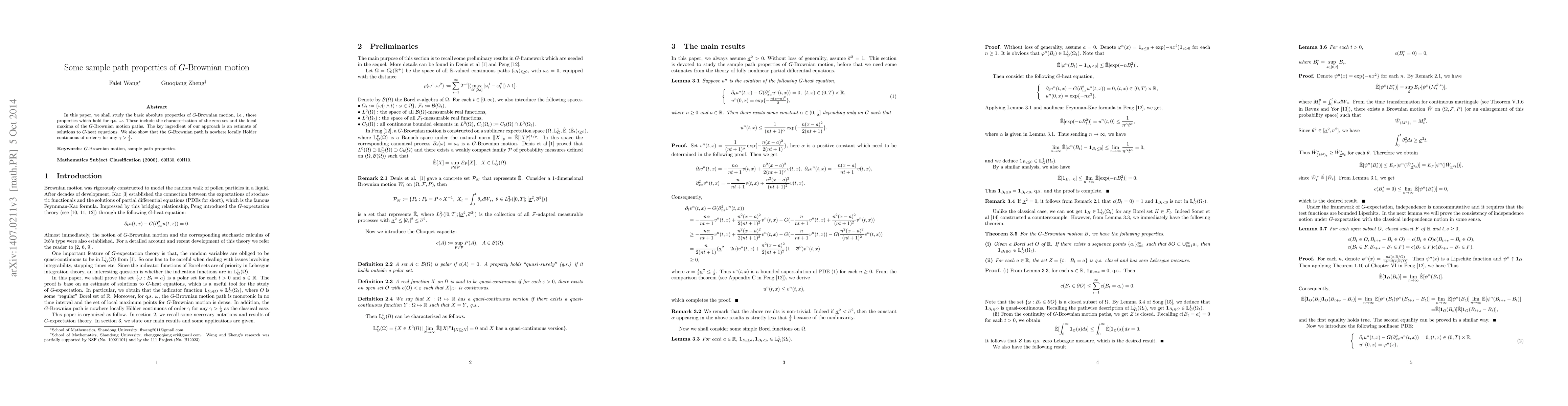 This paper investigates the fundamental properties of $G$-Brownian motion, focusing on its zero set and local maxima characteristics, and demonstrates that its indicator function belongs to $\mathbb{L}_G^1(\Omega)$, aiding in the study of $G$-expectation theory.
