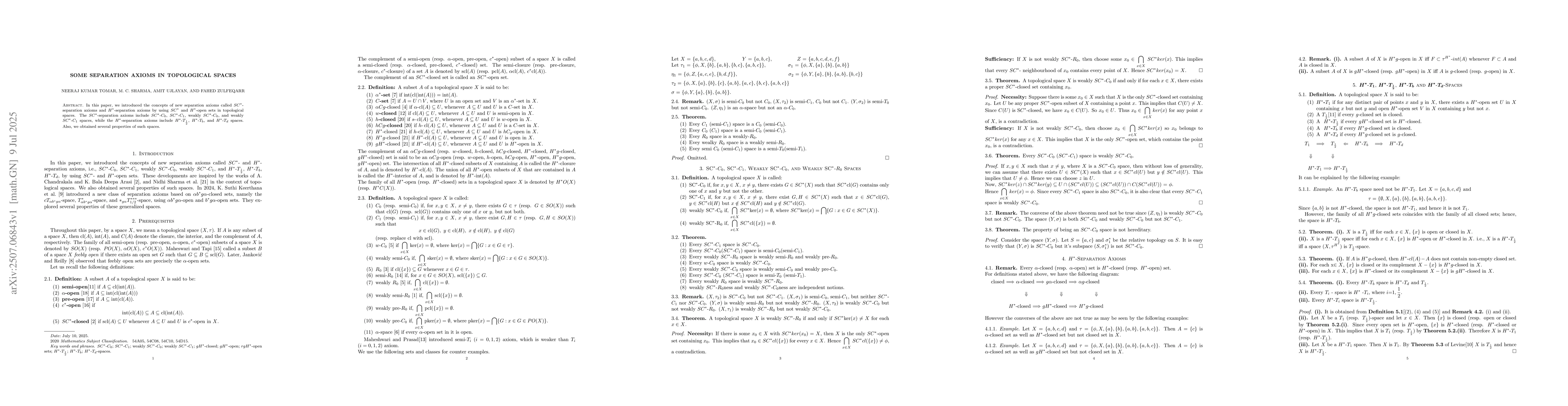 In this paper, we introduced the concepts of new separation axioms called $ SC^* $-separation axioms and $ H^* $-separation axioms by using $ SC^* $ and $ H^* $-open sets in topological spaces. The $ SC^* $-separation axioms include $ SC^* $-$ C_0 $, $ SC^* $-$ C_1 $, weakly $ SC^* $-$ C_0 $, and weakly $ SC^* $-$ C_1 $ spaces, while the $ H^* $-separation axioms include $ H^* $-$ T_{\frac{1}{2}} $, $ H^* $-$ T_b $, and $ H^* $-$ T_d $ spaces. Also, we obtained several properties of such spaces.