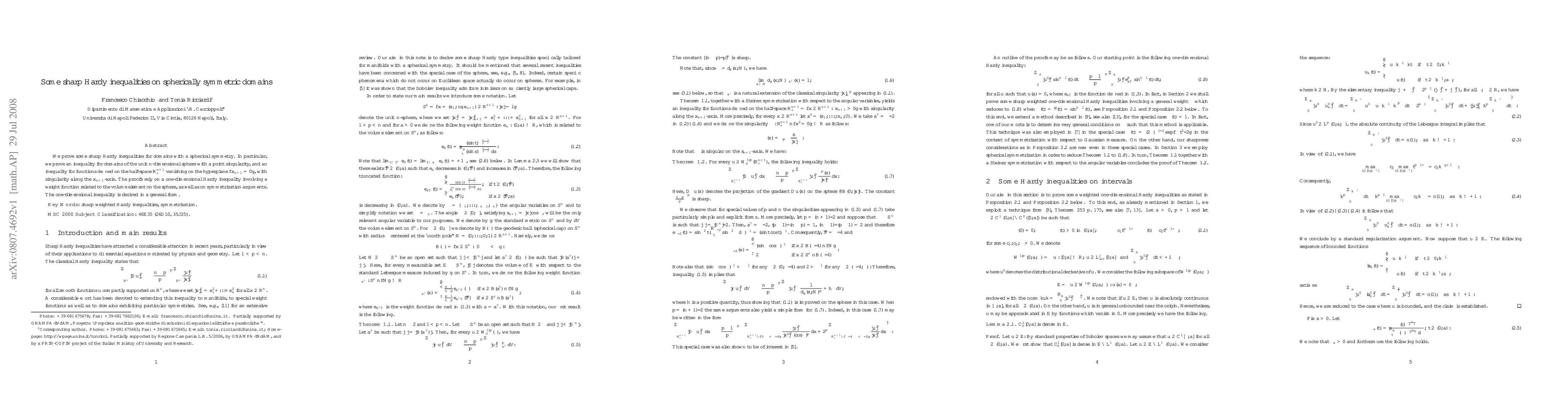 We prove some sharp Hardy inequalities for domains with a spherical symmetry. In particular, we prove an inequality for domains of the unit $n$-dimensional sphere with a point singularity, and an inequality for functions defined on the half-space $\R_+^{n+1}$} vanishing on the hyperplane $\{x_{n+1}=0\}$, with singularity along the $x_{n+1}$-axis. The proofs rely on a one-dimensional Hardy inequality involving a weight function related to the volume element on the sphere, as well as on symmetrization arguments. The one-dimensional inequality is derived in a general form.