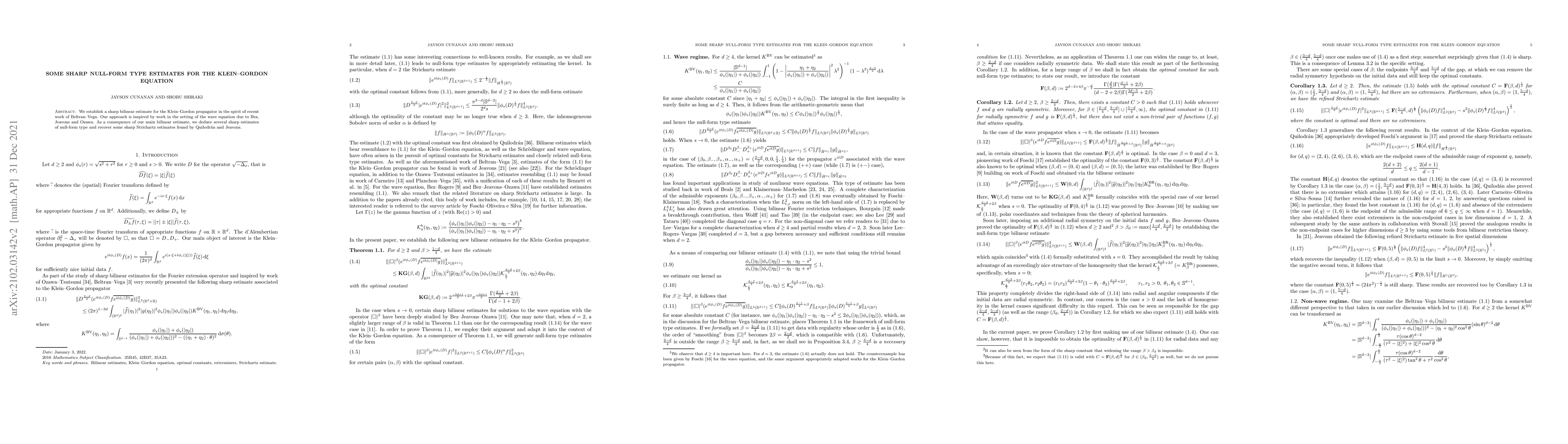 This paper establishes a sharp bilinear estimate for the Klein-Gordon propagator, inspired by methods from wave equation studies, leading to several null-form type estimates and recovering sharp Strichartz estimates previously found by Quilodrán and Jeavons.