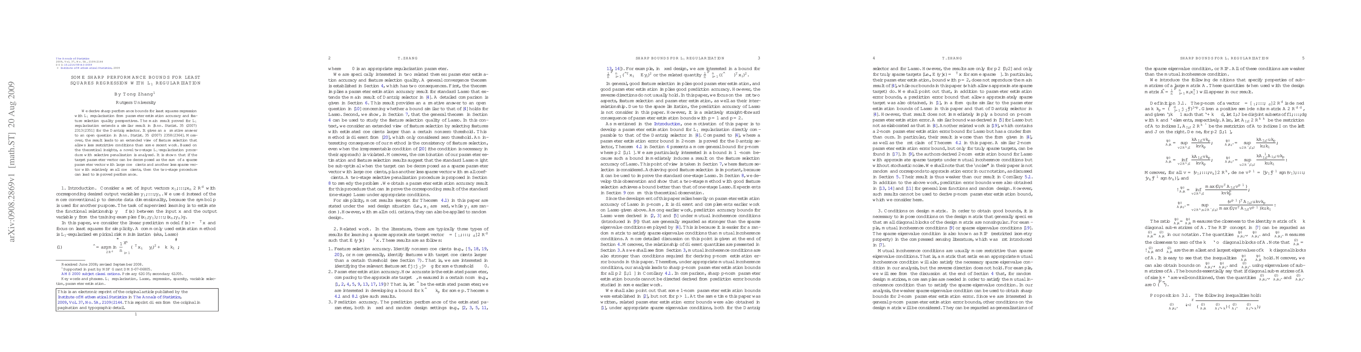 This paper derives sharp performance bounds for least squares regression with $L_1$ regularization, offering improved feature selection conditions and a novel two-stage procedure that outperforms traditional methods in certain cases.
