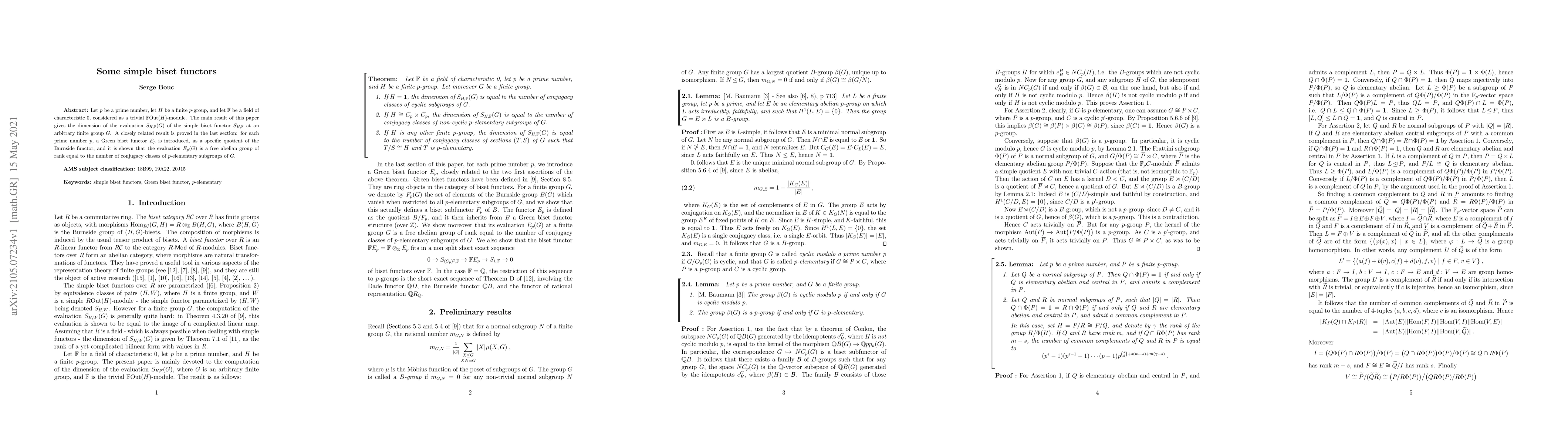 This paper presents a main result giving the dimension of a simple biset functor S_{H,ℍ}(G) for any finite group G, evaluated at a prime p-group H over a characteristic 0 field ℍ. Additionally, it introduces a Green biset functor Ep, a quotient of the Burnside functor, and proves Ep(G) is a free abelian group of rank equal to the number of conjugacy classes of p-elementary subgroups of G.