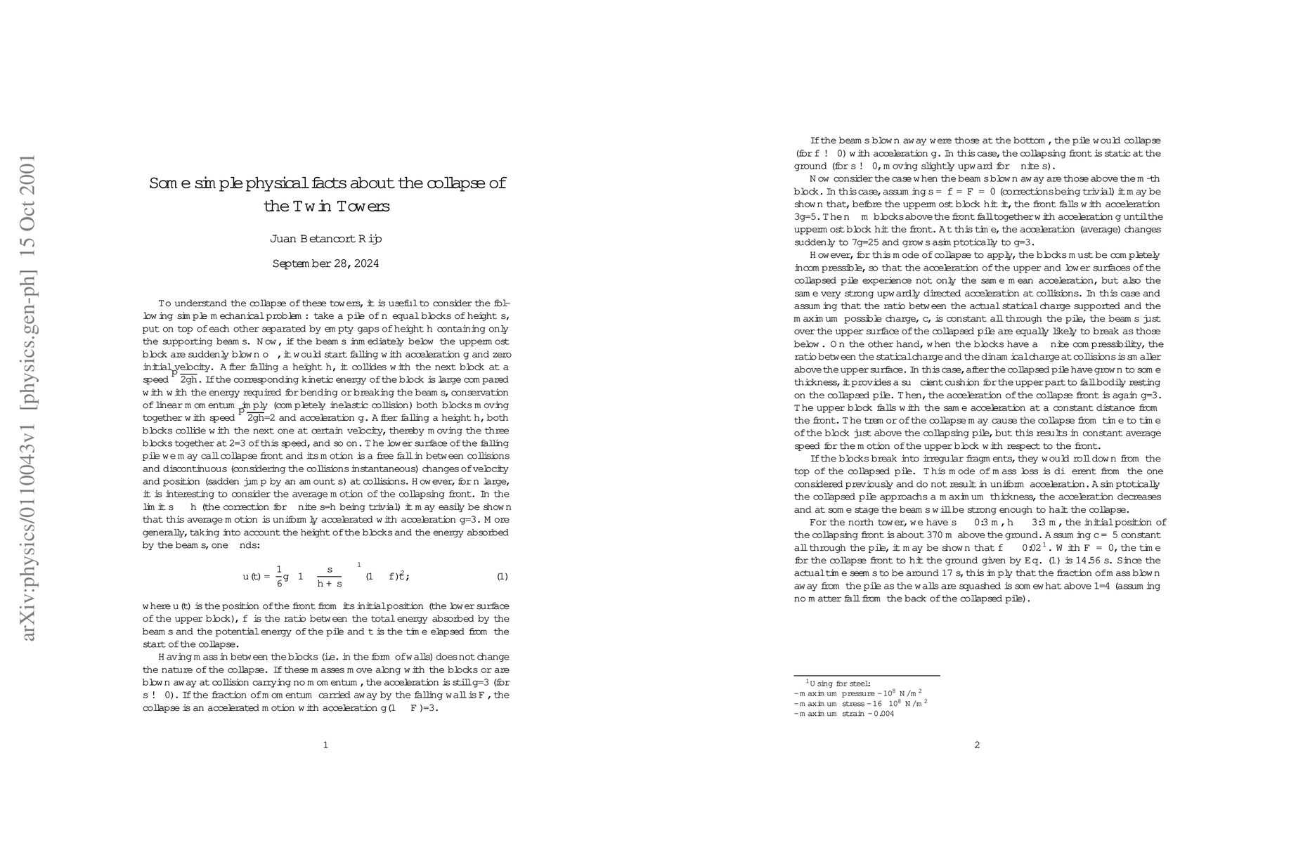 An analysis of the collapse of the Twin Towers is carried on with the aid of simple mechanical laws. The motion of the collapse front is calculated in terms of geometric and energetic quantities.