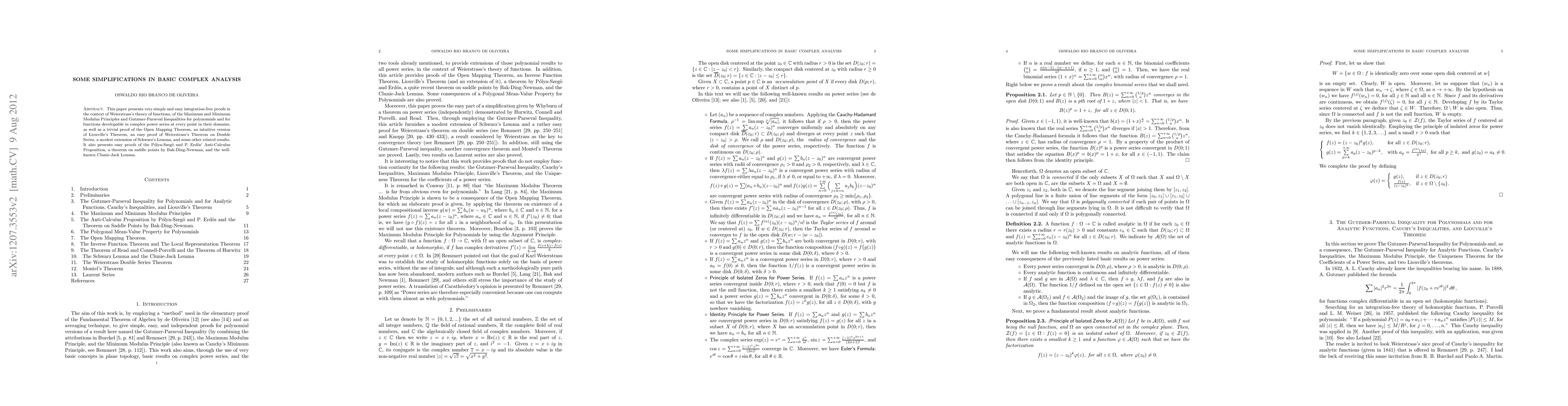 This paper offers straightforward, integration-free proofs for several fundamental results in complex analysis, including the Maximum and Minimum Modulus Principles, Gutzmer-Parseval Inequalities, and the Open Mapping Theorem, along with proofs for the Pólya-Szegő and Erdős' Anti-Calculus Proposition and the Clunie-Jack Lemma.