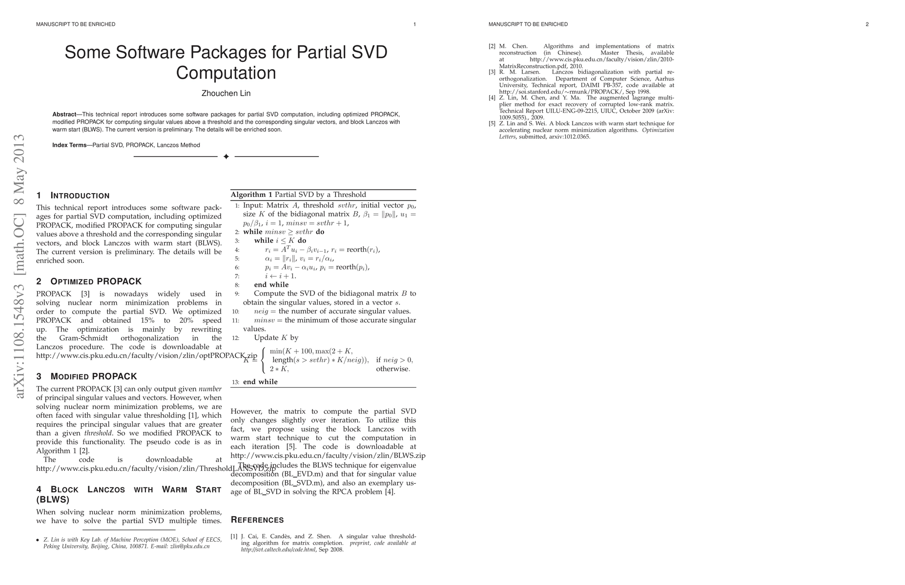 This technical report introduces some software packages for partial SVD computation, including optimized PROPACK, modified PROPACK for computing singular values above a threshold and the corresponding singular vectors, and block Lanczos with warm start (BLWS). The current version is preliminary. The details will be enriched soon.