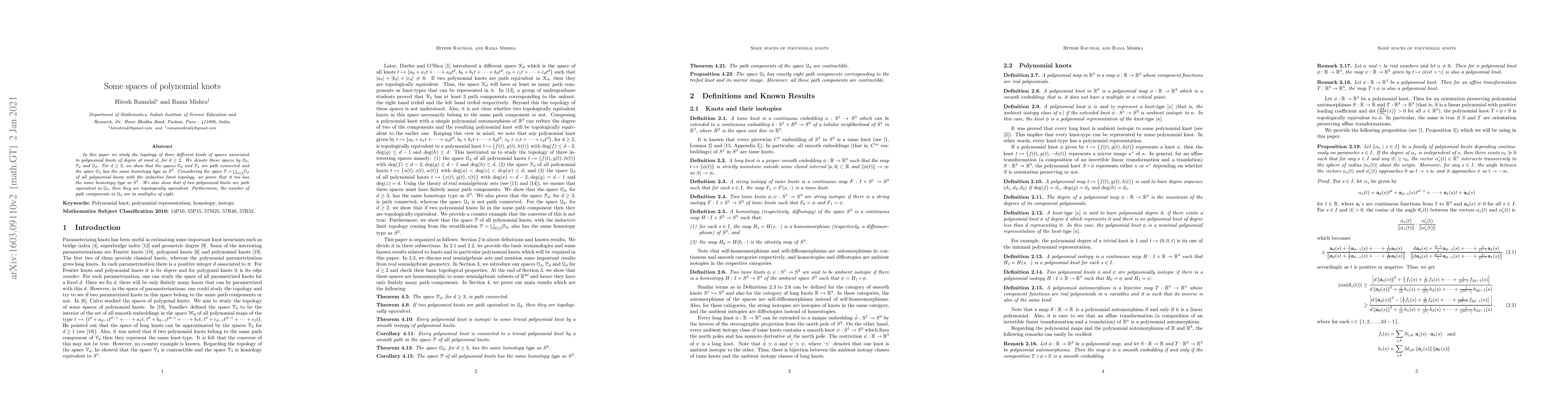 This paper investigates the topology of spaces associated with polynomial knots, proving that for $d\geq3$, $\mathcal{O}_d$ and $\mathcal{P}_d$ are path connected and $\mathcal{O}_d$ has the same homotopy type as $S^2$. It also demonstrates that $\mathcal{P}$ shares this homotopy type and concludes that path equivalence in $\mathcal{Q}_d$ implies topological equivalence, with $\mathcal{Q}_d$'s path components being multiples of eight.