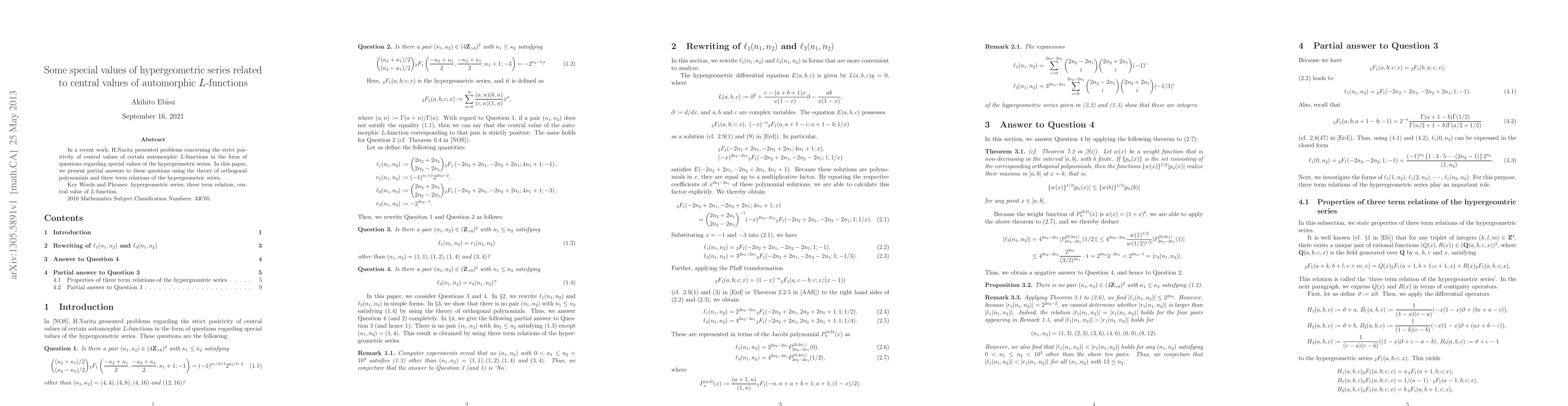 In a recent work, H.Narita presented problems concerning the strict positivity of central values of certain automorphic $L$-functions in the form of questions regarding special values of the hypergeometric series. In this paper, we present partial answers to these questions using the theory of orthogonal polynomials and three term relations of the hypergeometric series.