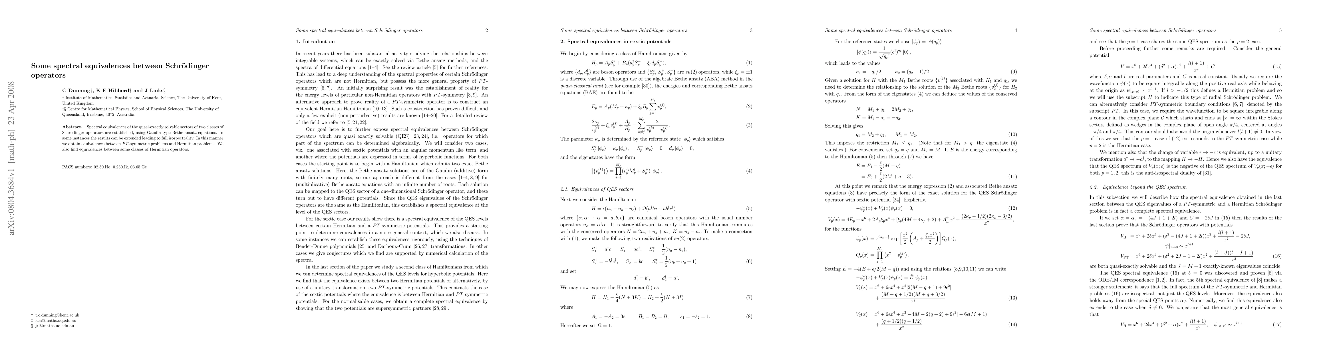 Spectral equivalences of the quasi-exactly solvable sectors of two classes of Schrodinger operators are established, using Gaudin-type Bethe ansatz equations. In some instances the results can be extended leading to full isospectrality. In this manner we obtain equivalences between PT-symmetric problems and Hermitian problems. We also find equivalences between some classes of Hermitian operators.