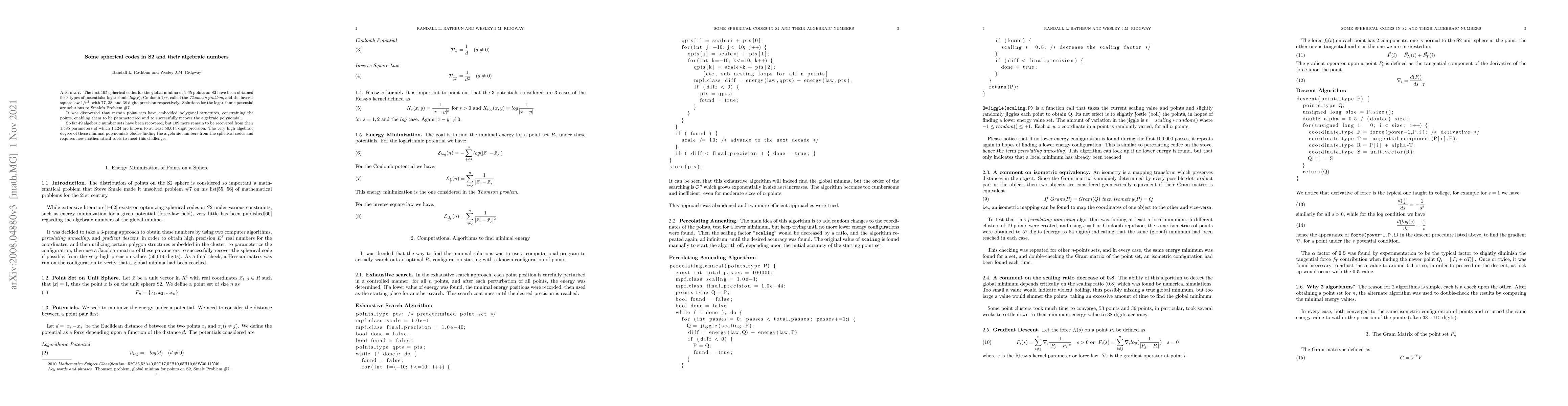 The first 195 spherical codes for the global minima of 1 to 65 points on S2 have been obtained for 3 types of potentials: logarithmic, Coulomb, called the Thomson problem, and the inverse square law, with 77, 38, and 38 digits precision respectively. It was discovered that certain point sets have embedded polygonal structures, constraining the points, enabling them to be parameterized and to successfully recover the algebraic polynomial. So far 49 algebraic number sets have been recovered, but 109 more remain to be recovered from their 1,622 parameters, 983 known to 50,014 digit precision. The very high algebraic degree of these minimal polynomials eludes finding the algebraic numbers from the spherical codes and requires new mathematical tools to meet this challenge.