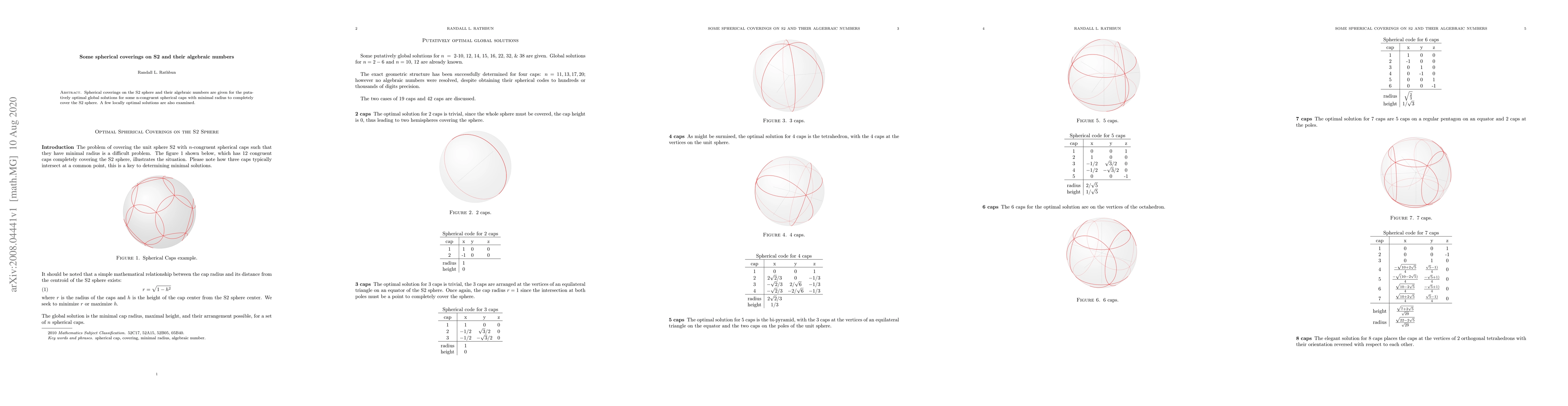 This paper finds optimal global solutions for covering the S2 sphere with spherical caps of minimal radius, and identifies their algebraic numbers. It also explores locally optimal solutions and their implications.