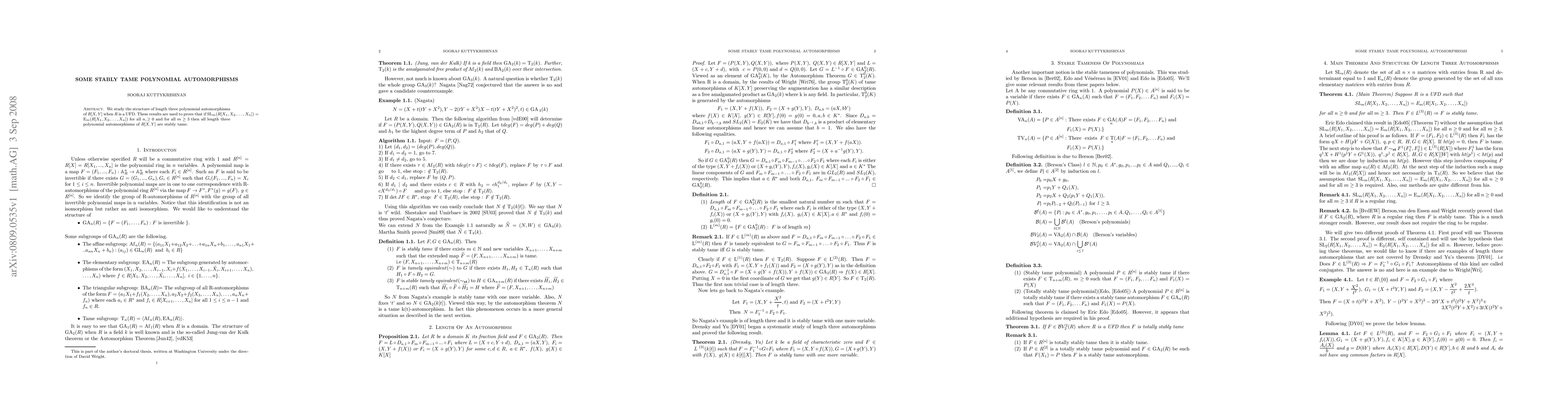 This paper investigates the structure of polynomial automorphisms of length three in $R[X,Y]$ when $R$ is a UFD, proving that if $\text{SL}_m(R[X_1,X_2,..., X_n]) = \text{E}_m(R[X_1,X_2,..., X_n])$ for all $n \ge 0$ and $m \ge 3$, then all length three polynomial automorphisms of $R[X,Y]$ are stably tame.