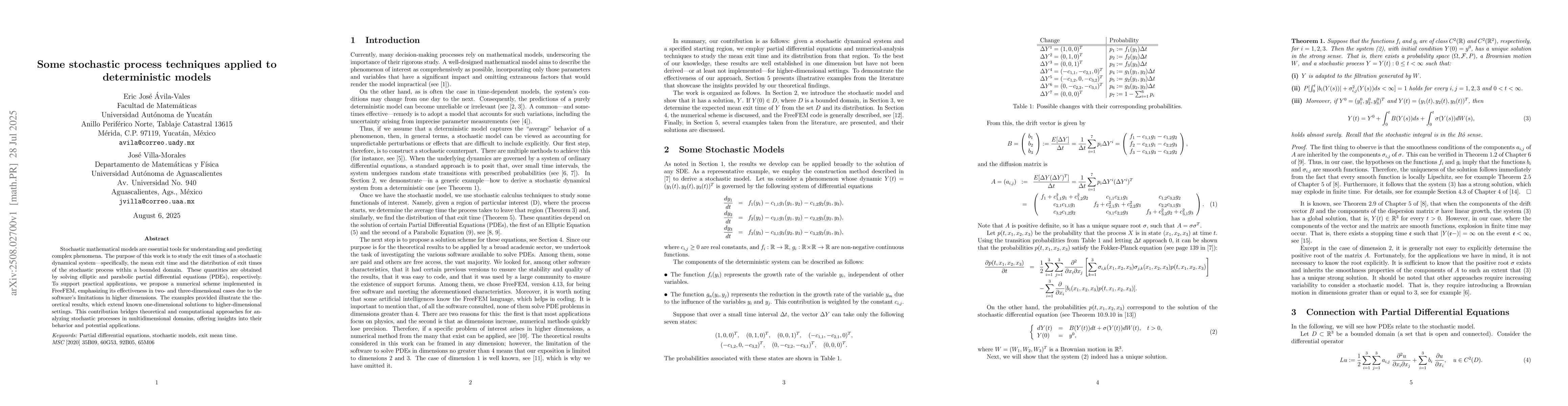 Stochastic mathematical models are essential tools for understanding and predicting complex phenomena. The purpose of this work is to study the exit times of a stochastic dynamical system-specifically, the mean exit time and the distribution of exit times of the stochastic process within a bounded domain. These quantities are obtained by solving elliptic and parabolic partial differential equations (PDEs), respectively. To support practical applications, we propose a numerical scheme implemented in FreeFEM, emphasizing its effectiveness in two- and three-dimensional cases due to the software's limitations in higher dimensions. The examples provided illustrate the theoretical results, which extend known one-dimensional solutions to higher-dimensional settings. This contribution bridges theoretical and computational approaches for analyzing stochastic processes in multidimensional domains, offering insights into their behavior and potential applications.